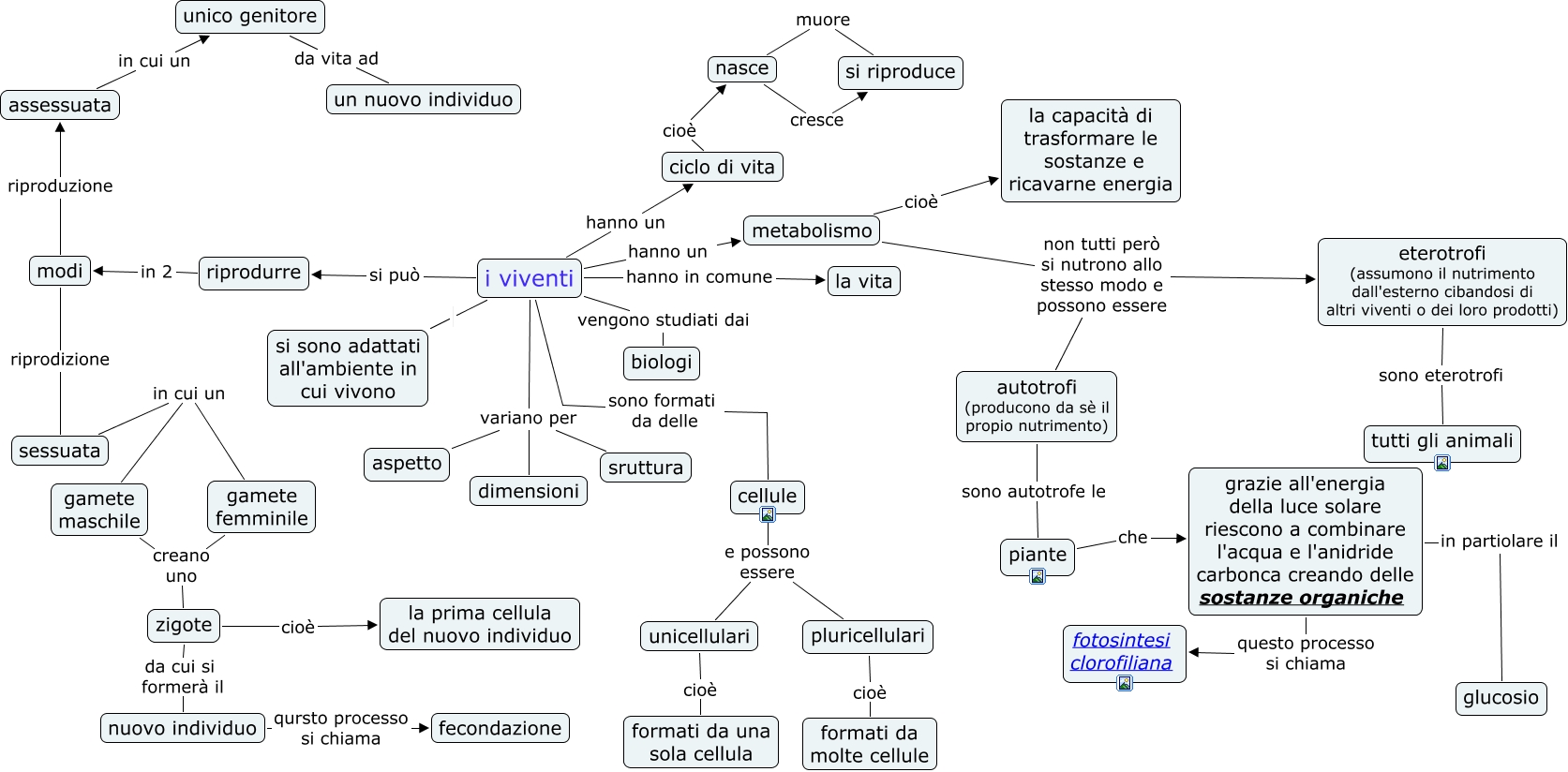 Questa Cmap, creata con IHMC CmapTools, contiene informazioni relative a: i viventi, pluricellulari cioè formati da molte cellule, gamete maschile creano uno zigote, grazie all'energia della luce solare riescono a combinare l'acqua e l'anidride carbonca creando delle sostanze organiche questo processo si chiama fotosintesi clorofiliana, metabolismo non tutti però si nutrono allo stesso modo e possono essere eterotrofi (assumono il nutrimento dall'esterno cibandosi di altri viventi o dei loro prodotti), grazie all'energia della luce solare riescono a combinare l'acqua e l'anidride carbonca creando delle sostanze organiche in partiolare il glucosio, i viventi variano per dimensioni, i viventi hanno in comune la vita, zigote da cui si formerà il nuovo individuo, autotrofi (producono da sè il propio nutrimento) sono autotrofe le piante, nuovo individuo qursto processo si chiama fecondazione, metabolismo non tutti però si nutrono allo stesso modo e possono essere autotrofi (producono da sè il propio nutrimento), modi riproduzione assessuata, i viventi vengono studiati dai biologi, gamete femminile creano uno zigote, unico genitore da vita ad un nuovo individuo, riprodurre in 2 modi, piante che grazie all'energia della luce solare riescono a combinare l'acqua e l'anidride carbonca creando delle sostanze organiche, unicellulari cioè formati da una sola cellula, i viventi variano per sruttura, i viventi si sono adattati all'ambiente in cui vivono