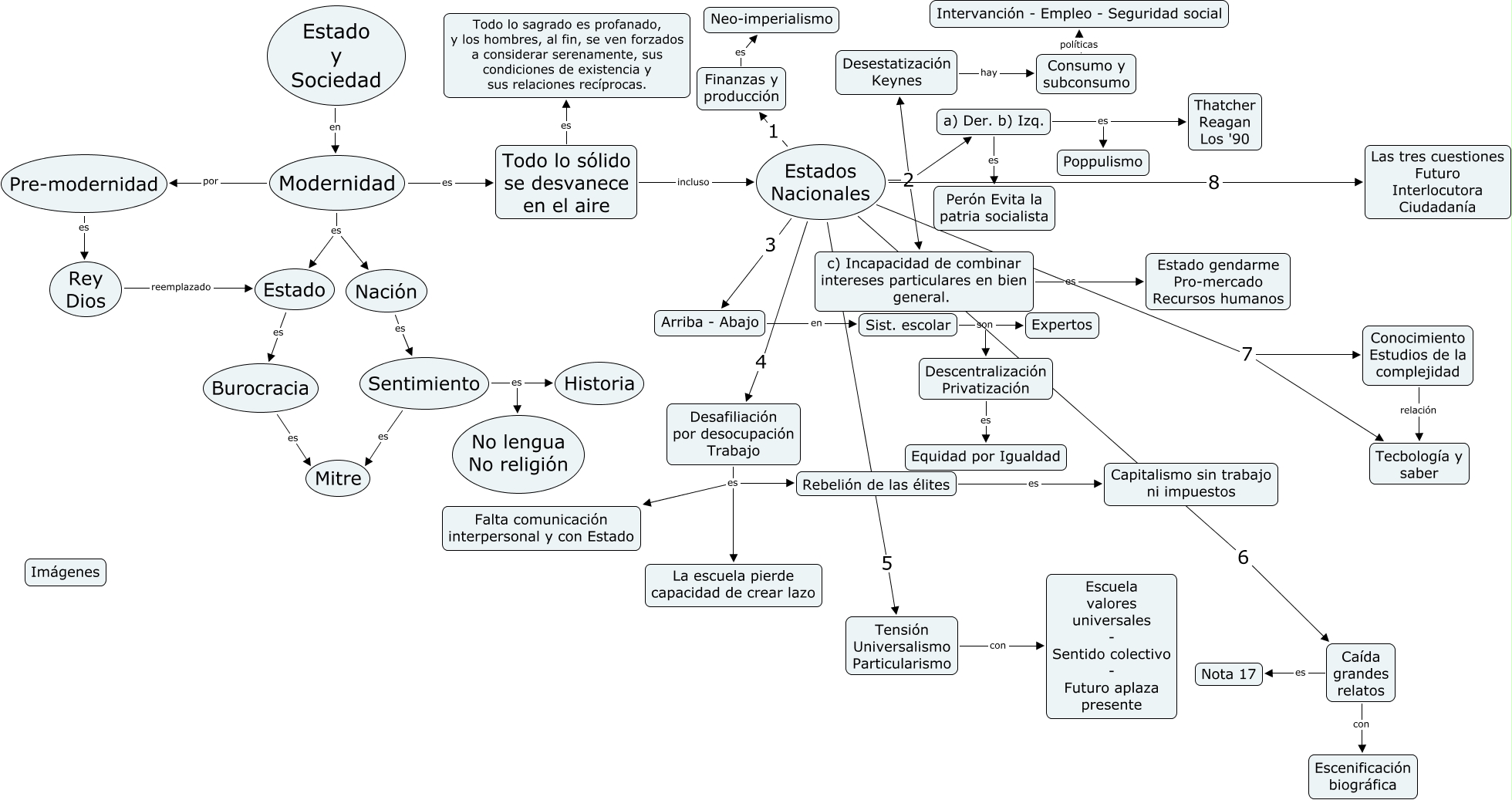 Este Cmap, tiene información relacionada con: ESOC_Tiramonti_U1_2, Sentimiento es No lengua No religión, Estados Nacionales 5 Tensión Universalismo Particularismo, Caída grandes relatos es Nota 17, Finanzas y producción es Neo-imperialismo, Rebelión de las élites es Capitalismo sin trabajo ni impuestos, Consumo y subconsumo políticas Intervanción - Empleo - Seguridad social, Caída grandes relatos con Escenificación biográfica, Desafiliación por desocupación Trabajo es Falta comunicación interpersonal y con Estado, Estados Nacionales 6 Caída grandes relatos, Sist. escolar son Descentralización Privatización, Conocimiento Estudios de la complejidad relación Tecbología y saber, c) Incapacidad de combinar intereses particulares en bien general. es Estado gendarme Pro-mercado Recursos humanos, Estados Nacionales 2 a) Der. b) Izq., Estado es Burocracia, Estado y Sociedad en Modernidad, Estados Nacionales 2 Desestatización Keynes, Desafiliación por desocupación Trabajo es La escuela pierde capacidad de crear lazo, Estados Nacionales 3 Arriba - Abajo, Estados Nacionales 7 Conocimiento Estudios de la complejidad, Estados Nacionales 1 Finanzas y producción