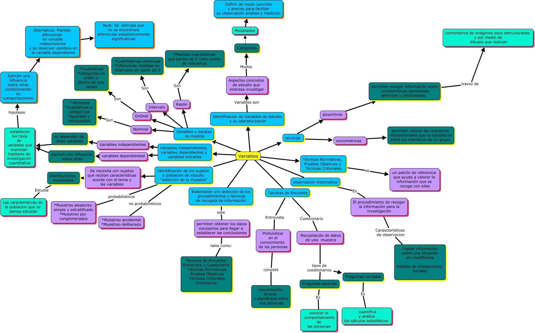 Este Cmap, tiene información relacionada con: variables, Técnicas Normativas, Pruebas Objetivas y Técnicas Criteriales es un patrón de referencia que ayuda a valorar la información que se recoge con ellas, Variables ???? Elaboración y/o selección de los procedimientos y técnicas de recogida de información, Modaliades ???? Definir de modo concreto y preciso para facilitar su observación analisis y medición, Aspectos concretos de estudio que interesa investigar Modos Modaliades, Variables ???? Identificación de los sujetos y población de estudio "seleccion de la muestra", Modaliades ???? Definir de modo concreto y preciso para facilitar su observación analisis y medición, Variables ???? Técnicas de Encuesta, Variables y escalas de medida ???? Intervalo, Distribuciones muestrales Estudia Las caracteristicas de la poblacion que se piensa estudiar, poyectivas ???? permiten recoger información sobre características personales, afectivas y emocionales, Variables ???? Técnicas Normativas, Pruebas Objetivas y Técnicas Criteriales, observación sistematica Es El procedimiento de recoger la información para la investigación, Variables y escalas de medida ???? Nominal, no dependen de otras variables ???? establecen los tipos de variables que expresan hipótesis de investigación cuantitativa, sociometricas ???? permiten valorar las relaciones nterpersonales que se establecen entre los miembros de un grupo, Elaboración y/o selección de los procedimientos y técnicas de recogida de información este permiten obtener los datos necesarios para llegar a establecer las conclusiones, Variables independientes, variables dependientes y variables extrañas ???? Variables independientes, Nominal Son * Atributos *Cualitativas o categoricas *Igualdad y desigualdad, Razón Son *Medidas cuantitativas que parten de 0 como punto de referencia, Ordinal Son *Cualitativas *Categorías en orden o dentro de una escala