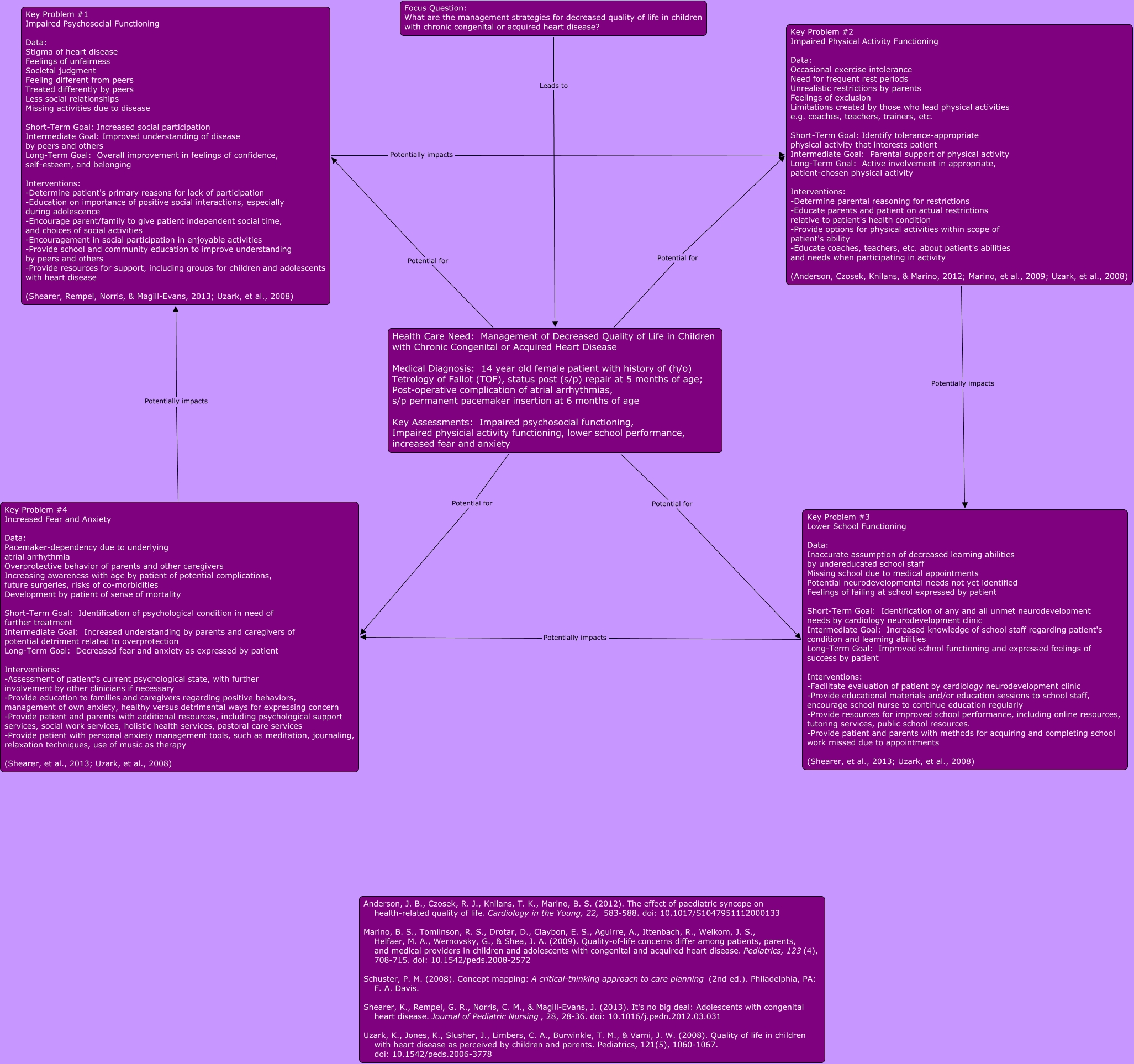 This Concept Map, created with IHMC CmapTools, has information related to: Quality of Life, Key Problem #1 Impaired Psychosocial Functioning Data: Stigma of heart disease Feelings of unfairness Societal judgment Feeling different from peers Treated differently by peers Less social relationships Missing activities due to disease Short-Term Goal: Increased social participation Intermediate Goal: Improved understanding of disease by peers and others Long-Term Goal: Overall improvement in feelings of confidence, self-esteem, and belonging Interventions: -Determine patient's primary reasons for lack of participation -Education on importance of positive social interactions, especially during adolescence -Encourage parent/family to give patient independent social time, and choices of social activities -Encouragement in social participation in enjoyable activities -Provide school and community education to improve understanding by peers and others -Provide resources for support, including groups for children and adolescents with heart disease (Shearer, Rempel, Norris, & Magill-Evans, 2013; Uzark, et al., 2008) Potentially impacts Key Problem #2 Impaired Physical Activity Functioning Data: Occasional exercise intolerance Need for frequent rest periods Unrealistic restrictions by parents Feelings of exclusion Limitations created by those who lead physical activities e.g. coaches, teachers, trainers, etc. Short-Term Goal: Identify tolerance-appropriate physical activity that interests patient Intermediate Goal: Parental support of physical activity Long-Term Goal: Active involvement in appropriate, patient-chosen physical activity Interventions: -Determine parental reasoning for restrictions -Educate parents and patient on actual restrictions relative to patient's health condition -Provide options for physical activities within scope of patient's ability -Educate coaches, teachers, etc. about patient's abilities and needs when participating in activity (Anderson, Czosek, Knilans, & Marino, 2012; Marino, et al., 2009; Uzark, et al., 2008), Key Problem #3 Lower School Functioning Data: Inaccurate assumption of decreased learning abilities by undereducated school staff Missing school due to medical appointments Potential neurodevelopmental needs not yet identified Feelings of failing at school expressed by patient Short-Term Goal: Identification of any and all unmet neurodevelopment needs by cardiology neurodevelopment clinic Intermediate Goal: Increased knowledge of school staff regarding patient's condition and learning abilities Long-Term Goal: Improved school functioning and expressed feelings of success by patient Interventions: -Facilitate evaluation of patient by cardiology neurodevelopment clinic -Provide educational materials and/or education sessions to school staff, encourage school nurse to continue education regularly -Provide resources for improved school performance, including online resources, tutoring services, public school resources. -Provide patient and parents with methods for acquiring and completing school work missed due to appointments (Shearer, et al., 2013; Uzark, et al., 2008) Potentially impacts Key Problem #4 Increased Fear and Anxiety Data: Pacemaker-dependency due to underlying atrial arrhythmia Overprotective behavior of parents and other caregivers Increasing awareness with age by patient of potential complications, future surgeries, risks of co-morbidities Development by patient of sense of mortality Short-Term Goal: Identification of psychological condition in need of further treatment Intermediate Goal: Increased understanding by parents and caregivers of potential detriment related to overprotection Long-Term Goal: Decreased fear and anxiety as expressed by patient Interventions: -Assessment of patient's current psychological state, with further involvement by other clinicians if necessary -Provide education to families and caregivers regarding positive behaviors, management of own anxiety, healthy versus detrimental ways for expressing concern -Provide patient and parents with additional resources, including psychological support services, social work services, holistic health services, pastoral care services -Provide patient with personal anxiety management tools, such as meditation, journaling, relaxation techniques, use of music as therapy (Shearer, et al., 2013; Uzark, et al., 2008), Health Care Need: Management of Decreased Quality of Life in Children with Chronic Congenital or Acquired Heart Disease Medical Diagnosis: 14 year old female patient with history of (h/o) Tetrology of Fallot (TOF), status post (s/p) repair at 5 months of age; Post-operative complication of atrial arrhythmias, s/p permanent pacemaker insertion at 6 months of age Key Assessments: Impaired psychosocial functioning, Impaired physicial activity functioning, lower school performance, increased fear and anxiety Potential for Key Problem #4 Increased Fear and Anxiety Data: Pacemaker-dependency due to underlying atrial arrhythmia Overprotective behavior of parents and other caregivers Increasing awareness with age by patient of potential complications, future surgeries, risks of co-morbidities Development by patient of sense of mortality Short-Term Goal: Identification of psychological condition in need of further treatment Intermediate Goal: Increased understanding by parents and caregivers of potential detriment related to overprotection Long-Term Goal: Decreased fear and anxiety as expressed by patient Interventions: -Assessment of patient's current psychological state, with further involvement by other clinicians if necessary -Provide education to families and caregivers regarding positive behaviors, management of own anxiety, healthy versus detrimental ways for expressing concern -Provide patient and parents with additional resources, including psychological support services, social work services, holistic health services, pastoral care services -Provide patient with personal anxiety