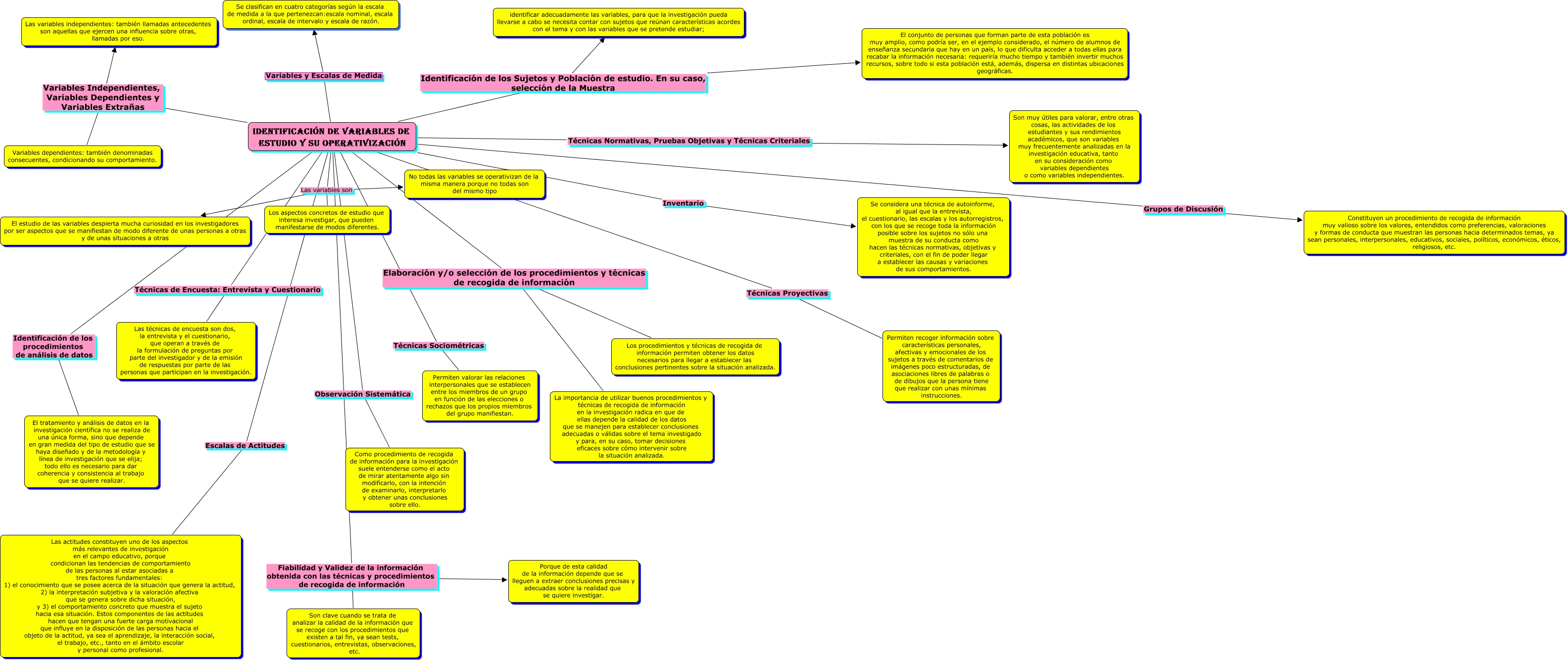 Este Cmap, tiene información relacionada con: Identificación de variables, Identificación de Variables de estudio y su operativización Grupos de Discusión Constituyen un procedimiento de recogida de información muy valioso sobre los valores, entendidos como preferencias, valoraciones y formas de conducta que muestran las personas hacia determinados temas, ya sean personales, interpersonales, educativos, sociales, políticos, económicos, éticos, religiosos, etc., Identificación de Variables de estudio y su operativización Técnicas Normativas, Pruebas Objetivas y Técnicas Criteriales Son muy útiles para valorar, entre otras cosas, las actividades de los estudiantes y sus rendimientos académicos, que son variables muy frecuentemente analizadas en la investigación educativa, tanto en su consideración como variables dependientes o como variables independientes., Identificación de Variables de estudio y su operativización Identificación de los procedimientos de análisis de datos El tratamiento y análisis de datos en la investigación científica no se realiza de una única forma, sino que depende en gran medida del tipo de estudio que se haya diseñado y de la metodología y línea de investigación que se elija; todo ello es necesario para dar coherencia y consistencia al trabajo que se quiere realizar., Identificación de Variables de estudio y su operativización Variables Independientes, Variables Dependientes y Variables Extrañas Variables dependientes: también denominadas consecuentes, condicionando su comportamiento., Identificación de Variables de estudio y su operativización Observación Sistemática Como procedimiento de recogida de información para la investigación suele entenderse como el acto de mirar atentamente algo sin modificarlo, con la intención de examinarlo, interpretarlo y obtener unas conclusiones sobre ello., Identificación de Variables de estudio y su operativización Inventario Se considera una técnica de autoinforme, al igual que la entrevista, el cuestionario, las escalas y los autorregistros, con los que se recoge toda la información posible sobre los sujetos no sólo una muestra de su conducta como hacen las técnicas normativas, objetivas y criteriales, con el fin de poder llegar a establecer las causas y variaciones de sus comportamientos., Identificación de Variables de estudio y su operativización Variables Independientes, Variables Dependientes y Variables Extrañas Las variables independientes: también llamadas antecedentes son aquellas que ejercen una influencia sobre otras, llamadas por eso., Identificación de Variables de estudio y su operativización Fiabilidad y Validez de la información obtenida con las técnicas y procedimientos de recogida de información Porque de esta calidad de la información depende que se lleguen a extraer conclusiones precisas y adecuadas sobre la realidad que se quiere investigar., Identificación de Variables de estudio y su operativización Las variables son El estudio de las variables despierta mucha curiosidad en los investigadores por ser aspectos que se manifiestan de modo diferente de unas personas a otras y de unas situaciones a otras, Identificación de Variables de estudio y su operativización Las variables son No todas las variables se operativizan de la misma manera porque no todas son del mismo tipo, Identificación de Variables de estudio y su operativización Técnicas Sociométricas Permiten valorar las relaciones interpersonales que se establecen entre los miembros de un grupo en función de las elecciones o rechazos que los propios miembros del grupo manifiestan., Identificación de Variables de estudio y su operativización Técnicas de Encuesta: Entrevista y Cuestionario Las técnicas de encuesta son dos, la entrevista y el cuestionario, que operan a través de la formulación de preguntas por parte del investigador y de la emisión de respuestas por parte de las personas que participan en la investigación., Identificación de Variables de estudio y su operativización Identificación de los Sujetos y Población de estudio. En su caso, selección de la Muestra El conjunto de personas que forman parte de esta población es muy amplio, como podría ser, en el ejemplo considerado, el número de alumnos de enseñanza secundaria que hay en un país, lo que dificulta acceder a todas ellas para recabar la información necesaria: requeriría mucho tiempo y también invertir muchos recursos, sobre todo si esta población está, además, dispersa en distintas ubicaciones geográficas., Identificación de Variables de estudio y su operativización Elaboración y/o selección de los procedimientos y técnicas de recogida de información Los procedimientos y técnicas de recogida de información permiten obtener los datos necesarios para llegar a establecer las conclusiones pertinentes sobre la situación analizada., Identificación de Variables de estudio y su operativización Escalas de Actitudes Las actitudes constituyen uno de los aspectos más relevantes de investigación en el campo educativo, porque condicionan las tendencias de comportamiento de las personas al estar asociadas a tres factores fundamentales: 1) el conocimiento que se posee acerca de la situación que genera la actitud, 2) la interpretación subjetiva y la valoración afectiva que se genera sobre dicha situación, y 3) el comportamiento concreto que muestra el sujeto hacia esa situación. Estos componentes de las actitudes hacen que tengan una fuerte carga motivacional que influye en la disposición de las personas hacia el objeto de la actitud, ya sea el aprendizaje, la interacción social, el trabajo, etc., tanto en el ámbito escolar y personal como profesional., Identificación de Variables de estudio y su operativización Las variables son Los aspectos concretos de estudio que interesa investigar, que pueden manifestarse de modos diferentes., Identificación de Variables de estudio y su operativización 