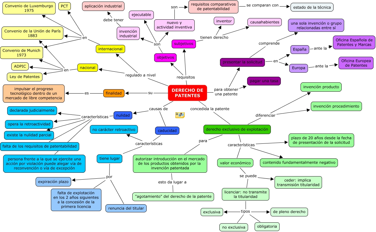 Este Cmap, tiene información relacionada con: Derecho de Patentes, derecho exclusivo de explotación características contenido fundamentalmente negativo, caducidad características tiene lugar, internacional en Convenio de Luxemburgo 1975, DERECHO DE PATENTES causas de nulidad, nulidad características existe la nulidad parcial, nulidad características falta de los requisitos de patentabilidad, DERECHO DE PATENTES regulado a nivel internacional, nulidad características declarada judicialmente, DERECHO DE PATENTES regulado a nivel nacional, licenciar: no transmite la titularidad tipos de pleno derecho, DERECHO DE PATENTES concedida la patente derecho exclusivo de explotación, DERECHO DE PATENTES causas de caducidad, nacional en ADPIC, derecho exclusivo de explotación para autorizar introducción en el mercado de los productos obtenidos por la invención patentada, presentar la solicitud comprende una sola invención o grupo relacionadas entre sí, presentar la solicitud en Europa, subjetivos tienen derecho causahabientes, valor económico se puede ceder: implica transmisión titularidad, invención industrial debe tener aplicación industrial, valor económico se puede licenciar: no transmite la titularidad
