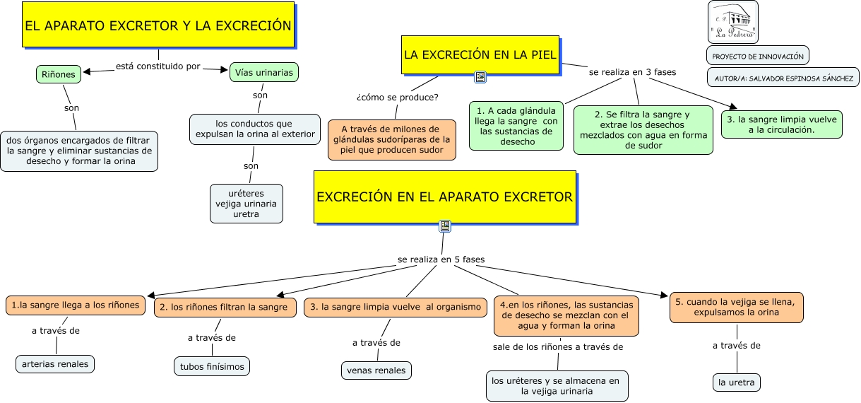 Este Cmap, tiene información relacionada con: EL APARATO EXCRETOR Y LA EXCRECIÓN, Riñones son dos órganos encargados de filtrar la sangre y eliminar sustancias de desecho y formar la orina, EXCRECIÓN EN EL APARATO EXCRETOR se realiza en 5 fases 3. la sangre limpia vuelve al organismo, 1.la sangre llega a los riñones a través de arterias renales, 4.en los riñones, las sustancias de desecho se mezclan con el agua y forman la orina sale de los riñones a través de los uréteres y se almacena en la vejiga urinaria, EL APARATO EXCRETOR Y LA EXCRECIÓN está constituido por Riñones, EL APARATO EXCRETOR Y LA EXCRECIÓN está constituido por Vías urinarias, EXCRECIÓN EN EL APARATO EXCRETOR se realiza en 5 fases 1.la sangre llega a los riñones, LA EXCRECIÓN EN LA PIEL se realiza en 3 fases 1. A cada glándula llega la sangre con las sustancias de desecho, 5. cuando la vejiga se llena, expulsamos la orina a través de la uretra, EXCRECIÓN EN EL APARATO EXCRETOR se realiza en 5 fases 2. los riñones filtran la sangre, los conductos que expulsan la orina al exterior son uréteres vejiga urinaria uretra, 3. la sangre limpia vuelve al organismo a través de venas renales, Vías urinarias son los conductos que expulsan la orina al exterior, 2. los riñones filtran la sangre a través de tubos finísimos, LA EXCRECIÓN EN LA PIEL ¿cómo se produce? A través de milones de glándulas sudoríparas de la piel que producen sudor, EXCRECIÓN EN EL APARATO EXCRETOR se realiza en 5 fases 5. cuando la vejiga se llena, expulsamos la orina, LA EXCRECIÓN EN LA PIEL se realiza en 3 fases 3. la sangre limpia vuelve a la circulación., EXCRECIÓN EN EL APARATO EXCRETOR se realiza en 5 fases 4.en los riñones, las sustancias de desecho se mezclan con el agua y forman la orina, LA EXCRECIÓN EN LA PIEL se realiza en 3 fases 2. Se filtra la sangre y extrae los desechos mezclados con agua en forma de sudor