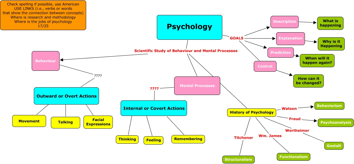 This Concept Map, created with IHMC CmapTools, has information related to: RutledgeCh 1 17, History of Psychology Freud Psychoanalysis, History of Psychology Watson Behaviorism, History of Psychology Wm. James Functionalism, Outward or Overt Actions ???? Movement, Facial Expressions ???? Outward or Overt Actions, Behaviour ???? Outward or Overt Actions, Outward or Overt Actions ???? Talking, Internal or Covert Actions ???? Remembering, Mental Processes ???? Internal or Covert Actions, Facial Expressions ???? Outward or Overt Actions, Psychology Scientific Study of Behaviour and Mental Processes Behaviour, Internal or Covert Actions ???? Thinking, Psychology Scientific Study of Behaviour and Mental Processes History of Psychology, Control ???? How can it be changed?, Facial Expressions ???? Outward or Overt Actions, Psychology GOALS Prediction, History of Psychology Titchener Structuralism, Psychology GOALS Control, Psychology GOALS Explanation, Explanation ???? Why is it Happening