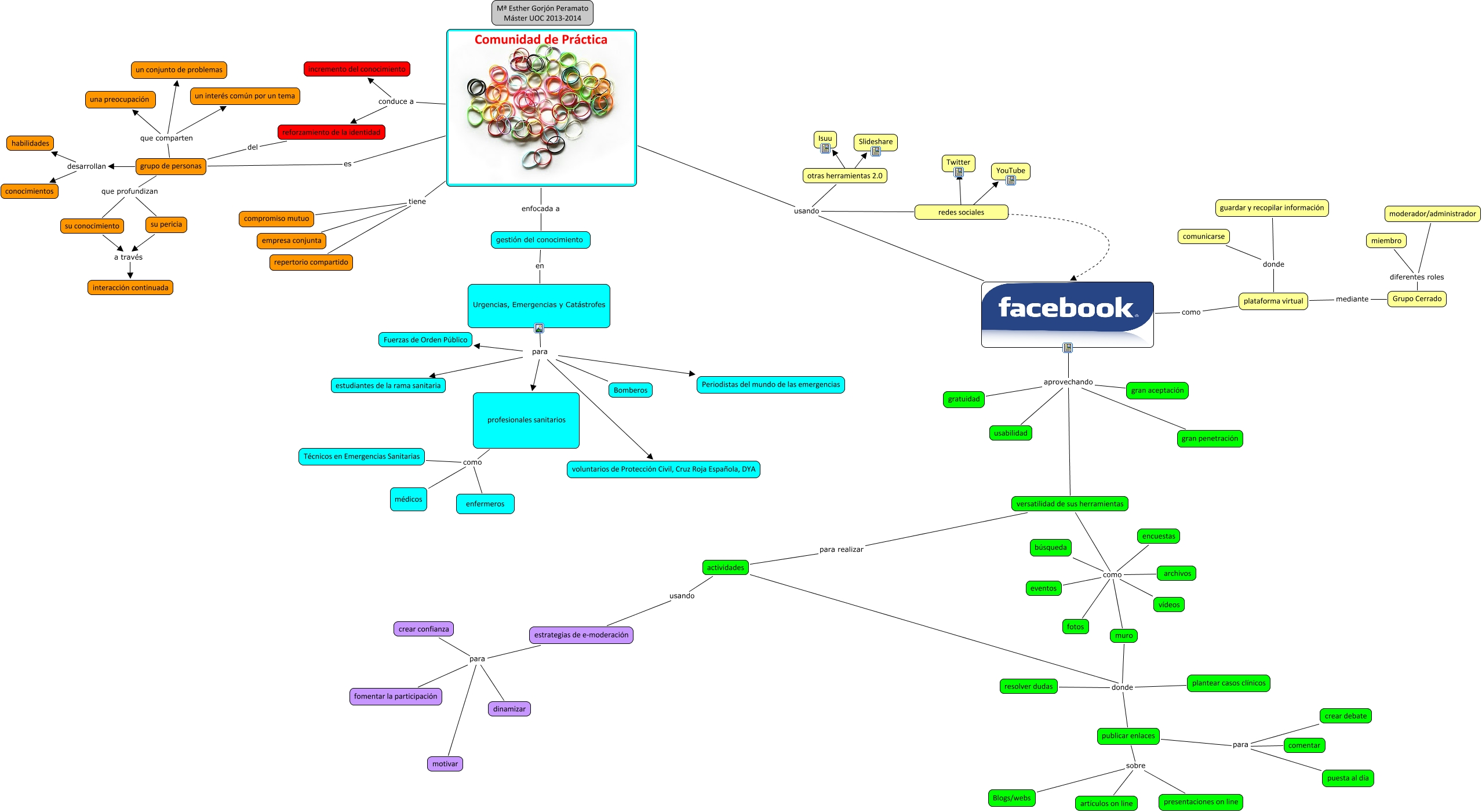 Este Cmap, tiene información relacionada con: CoP Urgencias y Emergencias, actividades donde publicar enlaces, grupo de personas que comparten una preocupación, Urgencias, Emergencias y Catástrofes para Fuerzas de Orden Público, versatilidad de sus herramientas como vídeos, publicar enlaces para crear debate, actividades usando estrategias de e-moderación, plataforma virtual donde comunicarse, profesionales sanitarios como médicos, grupo de personas que comparten un conjunto de problemas, otras herramientas 2.0 ???? Slideshare, profesionales sanitarios como enfermeros, publicar enlaces para comentar, Comunidad de Práctica usando otras herramientas 2.0, redes sociales ???? YouTube, plataforma virtual donde guardar y recopilar información, Comunidad de Práctica tiene compromiso mutuo, redes sociales ???? Twitter, muro donde plantear casos clínicos, grupo de personas que comparten un interés común por un tema, profesionales sanitarios como Técnicos en Emergencias Sanitarias