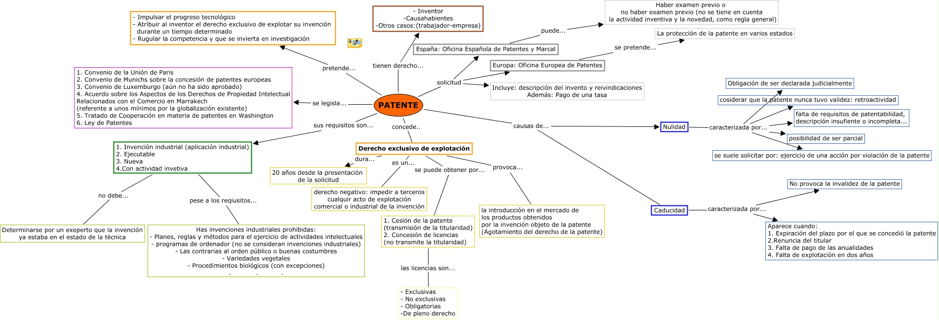 Este Cmap, tiene información relacionada con: Mapa Conceptual. Patente, Derecho exclusivo de explotación es un... derecho negativo: impedir a terceros cualquir acto de explotación comercial o industrial de la invención, PATENTE solicitud España: Oficina Española de Patentes y Marcal, 1. Invención industrial (aplicación industrial) 2. Ejecutable 3. Nueva 4.Con actividad invetiva no debe... Determinarse por un exeperto que la invención ya estaba en el estado de la tècnica, 1. Invención industrial (aplicación industrial) 2. Ejecutable 3. Nueva 4.Con actividad invetiva pese a los reqiusitos... Has invenciones industriales prohibidas: - Planes, reglas y métodos para el ejercicio de actividades intelectuales - programas de ordenador (no se consideran invenciones industriales) - Las contrarias al orden público o buenas costumbres - Variedades vegetales - Procedimientos biológicos (con excepciones) . . ., Derecho exclusivo de explotación dura... 20 años desde la presentación de la solicitud, PATENTE solicitud Incluye: descripción del invento y reivindicaciones Además: Pago de una tasa, PATENTE solicitud Europa: Oficina Europea de Patentes, Derecho exclusivo de explotación se puede obtener por... 1. Cesión de la patente (transmisión de la titularidad) 2. Concesión de licencias (no transmite la titularidad), PATENTE causas de... Nulidad, Nulidad caracterizada por... posibilidad de ser parcial, PATENTE tienen derecho... - Inventor -Causahabientes -Otros casos:(trabajador-empresa), Nulidad caracterizada por... Obligación de ser declarada judicialmente, Nulidad caracterizada por... se suele solicitar por: ejercicio de una acción por violación de la patente, 1. Cesión de la patente (transmisión de la titularidad) 2. Concesión de licencias (no transmite la titularidad) las licencias son... - Exclusivas - No exclusivas - Obligatorias -De pleno derecho, PATENTE se legisla... 1. Convenio de la Unión de Paris 2. Convenio de Munichs sobre la concesión de patentes europeas 3. Convenio de Luxemburgo (aún no ha sido aprobado) 4. Acuerdo sobre los Aspectos de los Derechos de Propiedad Intelectual Relacionados con el Comercio en Marrakech (referente a unos mínimos por la globalización existente) 5. Tratado de Cooperación en materia de patentes en Washington 6. Ley de Patentes, España: Oficina Española de Patentes y Marcal puede... Haber examen previo o no haber examen previo (no se tiene en cuenta la actividad inventiva y la novedad, como regla general), Nulidad caracterizada por... falta de requisitos de patentabilidad, descripción insufiente o incompleta..., Caducidad caracterizada por... No provoca la invalidez de la patente, Derecho exclusivo de explotación provoca... la introducción en el mercado de los productos obtenidos por la invención objeto de la patente (Agotamiento del derecho de la patente), Europa: Oficina Europea de Patentes se pretende... La protección de la patente en varios estados