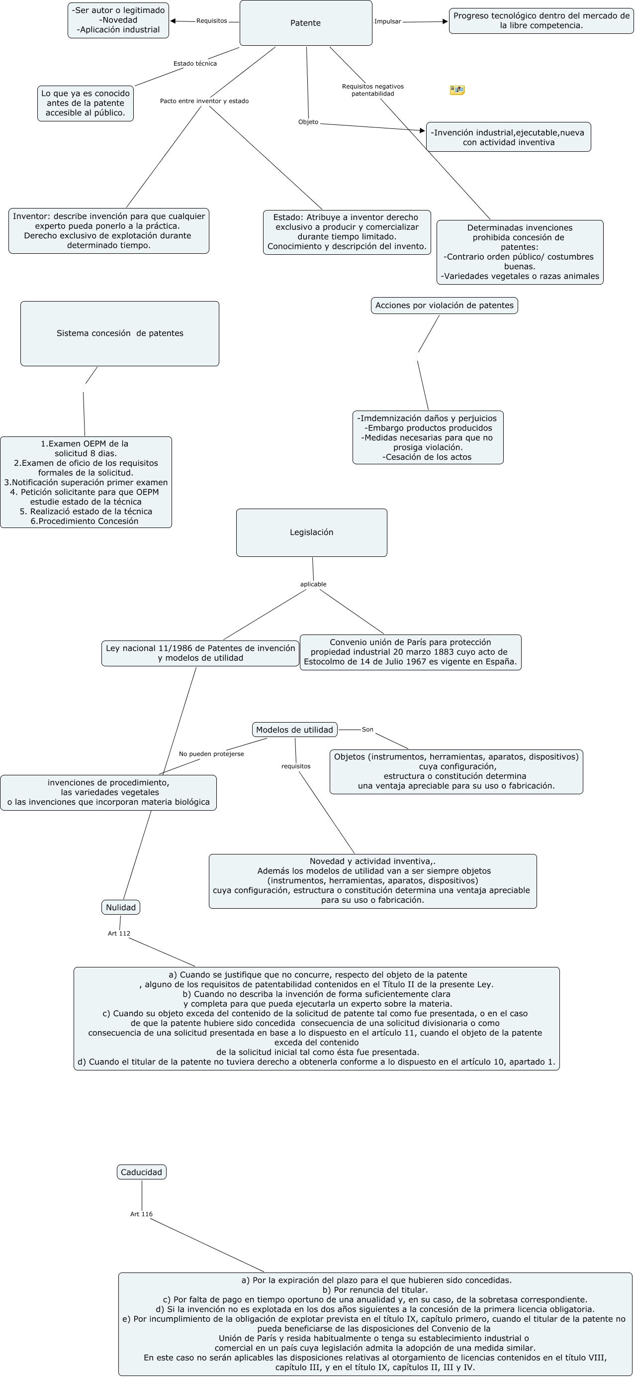 Este Cmap, tiene información relacionada con: robafaves, Ley nacional 11/1986 de Patentes de invención y modelos de utilidad ???? Nulidad, Patente Impulsar Progreso tecnológico dentro del mercado de la libre competencia., Patente Requisitos negativos patentabilidad Determinadas invenciones prohibida concesión de patentes: -Contrario orden público/ costumbres buenas. -Variedades vegetales o razas animales, Patente Pacto entre inventor y estado Estado: Atribuye a inventor derecho exclusivo a producir y comercializar durante tiempo limitado. Conocimiento y descripción del invento., Legislación aplicable Ley nacional 11/1986 de Patentes de invención y modelos de utilidad, Acciones por violación de patentes -Imdemnización daños y perjuicios -Embargo productos producidos -Medidas necesarias para que no prosiga violación. -Cesación de los actos, Patente Objeto -Invención industrial,ejecutable,nueva con actividad inventiva, Sistema concesión de patentes 1.Examen OEPM de la solicitud 8 dias. 2.Examen de oficio de los requisitos formales de la solicitud. 3.Notificación superación primer examen 4. Petición solicitante para que OEPM estudie estado de la técnica 5. Realizació estado de la técnica 6.Procedimiento Concesión, Patente Estado técnica Lo que ya es conocido antes de la patente accesible al público., Patente Requisitos -Ser autor o legitimado -Novedad -Aplicación industrial, Modelos de utilidad requisitos Novedad y actividad inventiva,. Además los modelos de utilidad van a ser siempre objetos (instrumentos, herramientas, aparatos, dispositivos) cuya configuración, estructura o constitución determina una ventaja apreciable para su uso o fabricación., Legislación aplicable Convenio unión de París para protección propiedad industrial 20 marzo 1883 cuyo acto de Estocolmo de 14 de Julio 1967 es vigente en España., Patente Pacto entre inventor y estado Inventor: describe invención para que cualquier experto pueda ponerlo a la práctica. Derecho exclusivo de explotación durante determinado tiempo., Nulidad Art 112 a) Cuando se justifique que no concurre, respecto del objeto de la patente , alguno de los requisitos de patentabilidad contenidos en el Título II de la presente Ley. b) Cuando no describa la invención de forma suficientemente clara y completa para que pueda ejecutarla un experto sobre la materia. c) Cuando su objeto exceda del contenido de la solicitud de patente tal como fue presentada, o en el caso de que la patente hubiere sido concedida consecuencia de una solicitud divisionaria o como consecuencia de una solicitud presentada en base a lo dispuesto en el artículo 11, cuando el objeto de la patente exceda del contenido de la solicitud inicial tal como ésta fue presentada. d) Cuando el titular de la patente no tuviera derecho a obtenerla conforme a lo dispuesto en el artículo 10, apartado 1., Modelos de utilidad Son Objetos (instrumentos, herramientas, aparatos, dispositivos) cuya configuración, estructura o constitución determina una ventaja apreciable para su uso o fabricación., Caducidad Art 116 a) Por la expiración del plazo para el que hubieren sido concedidas. b) Por renuncia del titular. c) Por falta de pago en tiempo oportuno de una anualidad y, en su caso, de la sobretasa correspondiente. d) Si la invención no es explotada en los dos años siguientes a la concesión de la primera licencia obligatoria. e) Por incumplimiento de la obligación de explotar prevista en el título IX, capítulo primero, cuando el titular de la patente no pueda beneficiarse de las disposiciones del Convenio de la Unión de París y resida habitualmente o tenga su establecimiento industrial o comercial en un país cuya legislación admita la adopción de una medida similar. En este caso no serán aplicables las disposiciones relativas al otorgamiento de licencias contenidos en el título VIII, capítulo III, y en el título IX, capítulos II, III y IV., Modelos de utilidad No pueden protejerse invenciones de procedimiento, las variedades vegetales o las invenciones que incorporan materia biológica