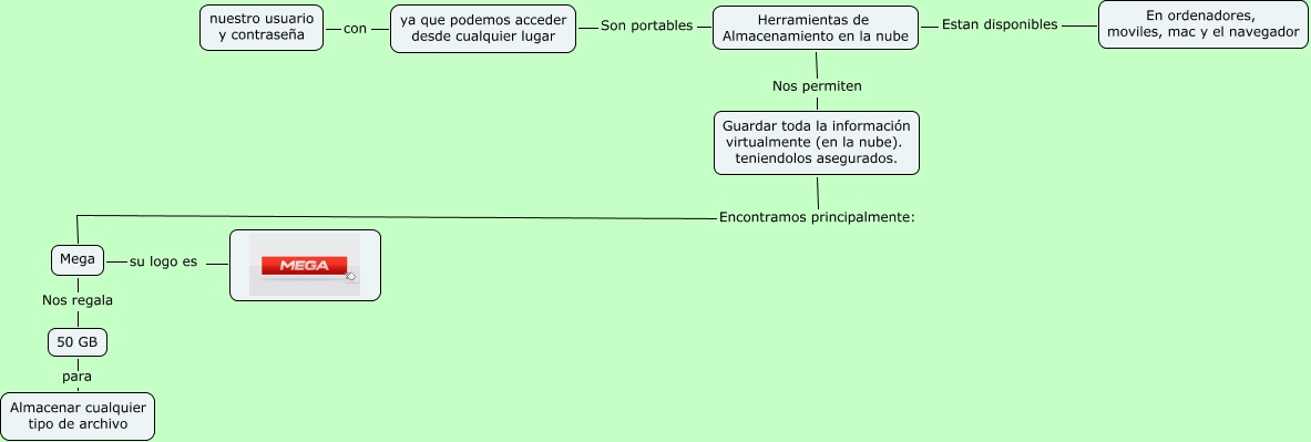 Este Cmap, tiene información relacionada con: Evaluacion_final_CaicedoJ_06_1006_Almacenamiento en la nube, 50 GB para Almacenar cualquier tipo de archivo, Mega Nos regala 50 GB, ya que podemos acceder desde cualquier lugar con nuestro usuario y contraseña, Guardar toda la información virtualmente (en la nube). teniendolos asegurados. Encontramos principalmente: Mega, Herramientas de Almacenamiento en la nube Estan disponibles En ordenadores, moviles, mac y el navegador, Mega su logo es, Herramientas de Almacenamiento en la nube Son portables ya que podemos acceder desde cualquier lugar, Herramientas de Almacenamiento en la nube Nos permiten Guardar toda la información virtualmente (en la nube). teniendolos asegurados.