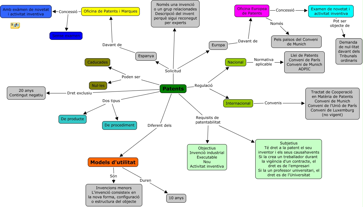 Este Cmap, tiene información relacionada con: Robafaves, Patents Solicitud Només una invenció o un grup relacionades Descripció del invent perquè sigui reconegut per experts, Oficina Europea de Patents Només Pels països del Conveni de Munich, Patents Requisits de patentabilitat Subjetius Té dret a la patent el seu inventor i els seus causahavents Si la crea un treballador durant la vigència d'un contracte, el dret es de l'empresari Si la un professor universitari, el dret es de l'Universitat, Oficina Europea de Patents Concessió Examen de novetat i activitat inventiva, Internacional Convenis Tractat de Cooperació en Matèria de Patents Conveni de Munich Conveni de l'Unió de París Conveni de Luxemburg (no vigent), Examen de novetat i activitat inventiva Pot ser objecte de Demanda de nul·litat davant dels Tribunals ordinaris, Patents Solicitud Europa, Patents Dret exclusiu 20 anys Contingut negatiu, Models d'utilitat Són Invencions menors L'invenció consisteix en la nova forma, configuració o estructura del objecte, Nacional Normativa aplicable Llei de Patents Conveni de París Conveni de Munich ADPIC, Espanya Davant de Oficina de Patents i Marques, Europa Davant de Oficina Europea de Patents, Patents Requisits de patentabilitat Objectius Invenció industrial Executable Nou Activitat inventiva, Patents Solicitud Espanya, Patents Dos tipus De producte, Patents Regulació Nacional, Patents Poden ser Caducades, Models d'utilitat Duren 10 anys, Patents Poden ser Nul·les, Patents Regulació Internacional