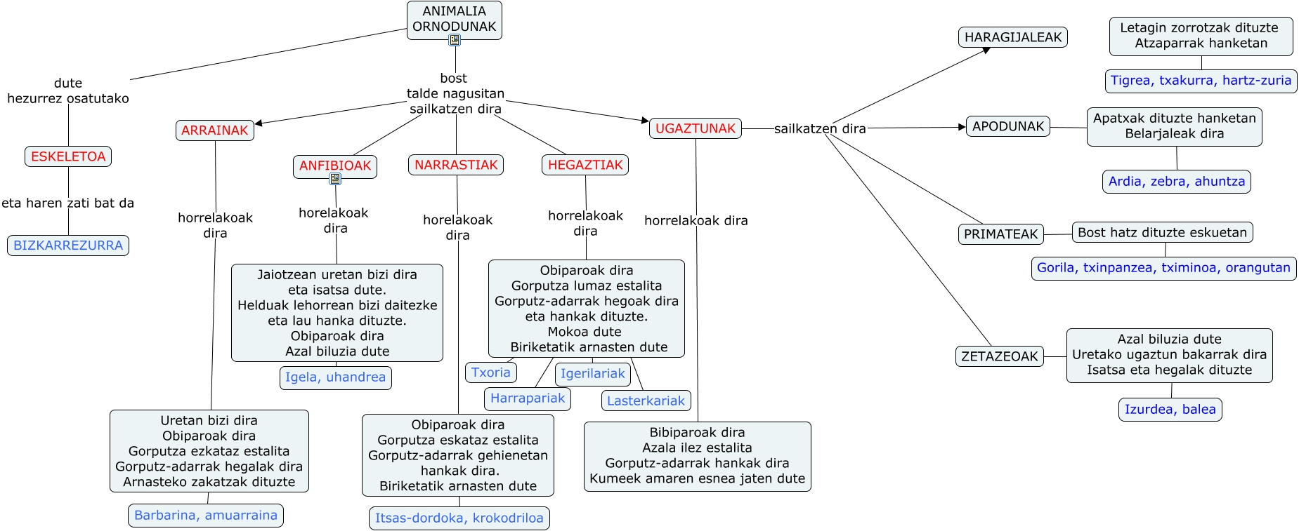 Este Cmap, tiene información relacionada con: Animaliak-Ornodunak, Apatxak dituzte hanketan Belarjaleak dira ???? Ardia, zebra, ahuntza, APODUNAK ???? Apatxak dituzte hanketan Belarjaleak dira, UGAZTUNAK sailkatzen dira APODUNAK, Letagin zorrotzak dituzte Atzaparrak hanketan ???? Tigrea, txakurra, hartz-zuria, ANIMALIA ORNODUNAK bost talde nagusitan sailkatzen dira ANFIBIOAK, ANIMALIA ORNODUNAK bost talde nagusitan sailkatzen dira HEGAZTIAK, ZETAZEOAK ???? Azal biluzia dute Uretako ugaztun bakarrak dira Isatsa eta hegalak dituzte, UGAZTUNAK sailkatzen dira PRIMATEAK, ANFIBIOAK horelakoak dira Jaiotzean uretan bizi dira eta isatsa dute. Helduak lehorrean bizi daitezke eta lau hanka dituzte. Obiparoak dira Azal biluzia dute, ANIMALIA ORNODUNAK bost talde nagusitan sailkatzen dira UGAZTUNAK, HEGAZTIAK horrelakoak dira Obiparoak dira Gorputza lumaz estalita Gorputz-adarrak hegoak dira eta hankak dituzte. Mokoa dute Biriketatik arnasten dute, ANIMALIA ORNODUNAK bost talde nagusitan sailkatzen dira ARRAINAK, UGAZTUNAK sailkatzen dira HARAGIJALEAK, NARRASTIAK horelakoak dira Obiparoak dira Gorputza eskataz estalita Gorputz-adarrak gehienetan hankak dira. Biriketatik arnasten dute, ANIMALIA ORNODUNAK bost talde nagusitan sailkatzen dira NARRASTIAK, Bost hatz dituzte eskuetan ???? Gorila, txinpanzea, tximinoa, orangutan, Obiparoak dira Gorputza lumaz estalita Gorputz-adarrak hegoak dira eta hankak dituzte. Mokoa dute Biriketatik arnasten dute ???? Lasterkariak, Obiparoak dira Gorputza lumaz estalita Gorputz-adarrak hegoak dira eta hankak dituzte. Mokoa dute Biriketatik arnasten dute ???? Txoria, Jaiotzean uretan bizi dira eta isatsa dute. Helduak lehorrean bizi daitezke eta lau hanka dituzte. Obiparoak dira Azal biluzia dute ???? Igela, uhandrea, PRIMATEAK ???? Bost hatz dituzte eskuetan