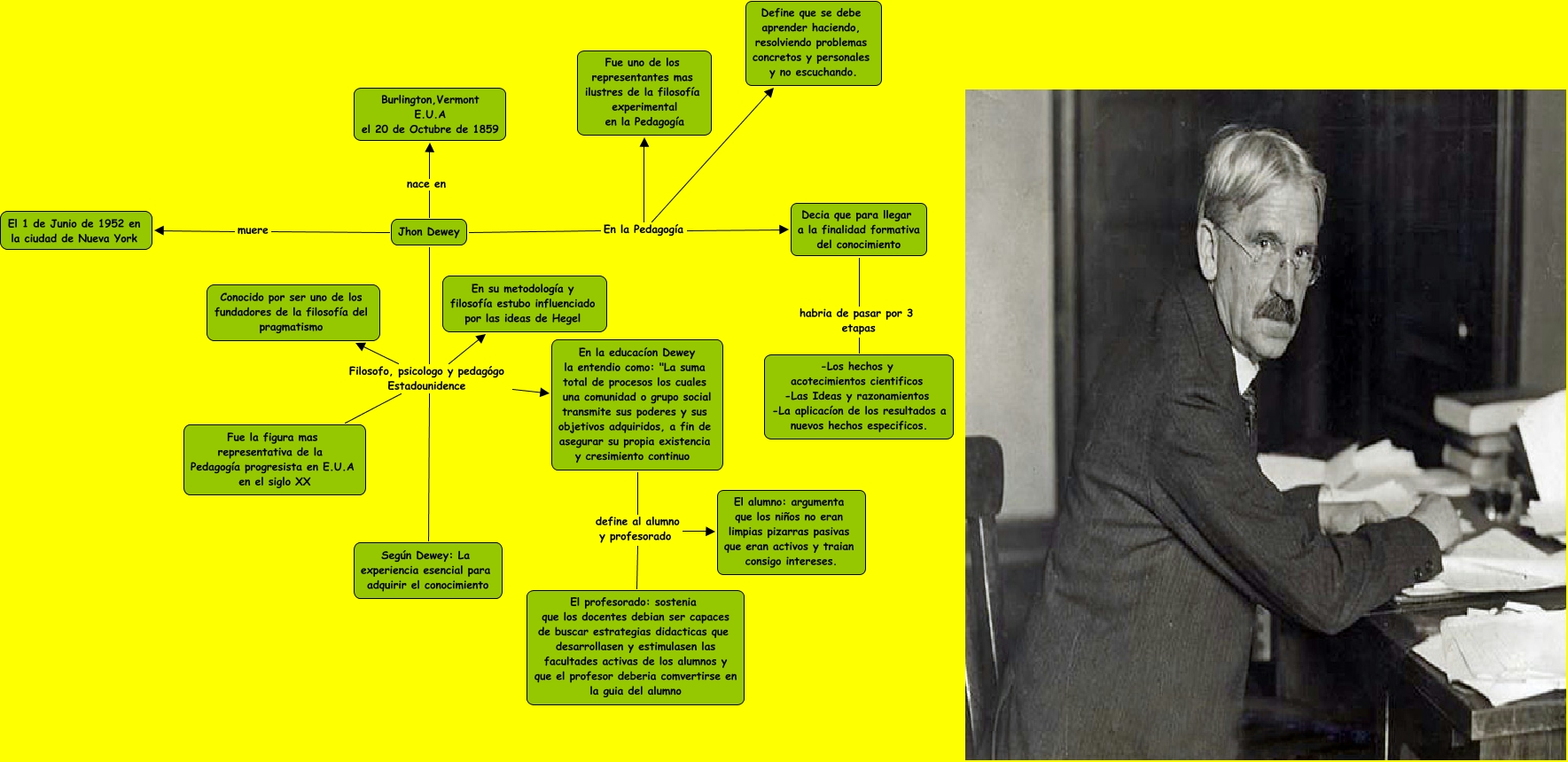 Este Cmap, tiene información relacionada con: DEWEY, Jhon Dewey Filosofo, psicologo y pedagógo Estadounidence Conocido por ser uno de los fundadores de la filosofía del pragmatismo, Jhon Dewey En la Pedagogía Decia que para llegar a la finalidad formativa del conocimiento, Jhon Dewey Filosofo, psicologo y pedagógo Estadounidence En la educacíon Dewey la entendio como: "La suma total de procesos los cuales una comunidad o grupo social transmite sus poderes y sus objetivos adquiridos, a fin de asegurar su propia existencia y cresimiento continuo, Jhon Dewey Filosofo, psicologo y pedagógo Estadounidence Fue la figura mas representativa de la Pedagogía progresista en E.U.A en el siglo XX, Decia que para llegar a la finalidad formativa del conocimiento habria de pasar por 3 etapas -Los hechos y acotecimientos cientificos -Las Ideas y razonamientos -La aplicacíon de los resultados a nuevos hechos especificos., En la educacíon Dewey la entendio como: "La suma total de procesos los cuales una comunidad o grupo social transmite sus poderes y sus objetivos adquiridos, a fin de asegurar su propia existencia y cresimiento continuo define al alumno y profesorado El profesorado: sostenia que los docentes debian ser capaces de buscar estrategias didacticas que desarrollasen y estimulasen las facultades activas de los alumnos y que el profesor deberia comvertirse en la guia del alumno, En la educacíon Dewey la entendio como: "La suma total de procesos los cuales una comunidad o grupo social transmite sus poderes y sus objetivos adquiridos, a fin de asegurar su propia existencia y cresimiento continuo define al alumno y profesorado El alumno: argumenta que los niños no eran limpias pizarras pasivas que eran activos y traian consigo intereses., Jhon Dewey En la Pedagogía Fue uno de los representantes mas ilustres de la filosofía experimental en la Pedagogía, Jhon Dewey nace en Burlington,Vermont E.U.A el 20 de Octubre de 1859, Jhon Dewey Filosofo, psicologo y pedagógo Estadounidence En su metodología y filosofía estubo influenciado por las ideas de Hegel, Jhon Dewey Filosofo, psicologo y pedagógo Estadounidence Según Dewey: La experiencia esencial para adquirir el conocimiento, Jhon Dewey En la Pedagogía Define que se debe aprender haciendo, resolviendo problemas concretos y personales y no escuchando., Jhon Dewey muere El 1 de Junio de 1952 en la ciudad de Nueva York