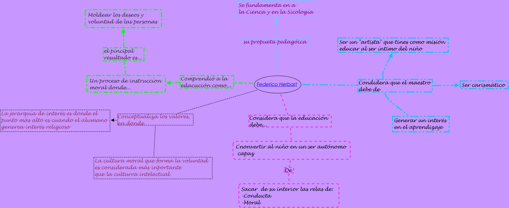 Este Cmap, tiene información relacionada con: Herbart, Federico Herbart Conceptualiza los valores, en donde La jerarquía de interés es donde el punto más alto es cuando el alumano generea interés religioso, Federico Herbart Comprendió a la edacución como... Un proceso de instruccíon moral donde..., Federico Herbart Conceptualiza los valores, en donde La cultura moral que forma la voluntad es considerada más inportante que la culturra intelectual, Federico Herbart su propueta pedagóica Se fundamenta en a la Cienca y en la Sicología, Federico Herbart Condidera que el maestro debe de Ser carismático, Federico Herbart Condidera que el maestro debe de Generar un interés en el aprendizaje, Federico Herbart Condidera que el maestro debe de Ser un "artista" que tines como misión educar al ser íntimo del niño, Un proceso de instruccíon moral donde... el pincipal resultado es... Moldear los deseos y voluntad de las personas, Federico Herbart Considera que la educación debe... Cnonvertir al niño en un ser autónomo capaz, Cnonvertir al niño en un ser autónomo capaz De Sacar de su interior las relas de: -Conducta -Moral