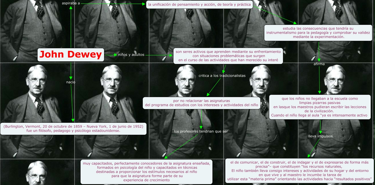 Este Cmap, tiene información relacionada con: dewey, por no relacionar las asignaturas del programa de estudios con los intereses y actividades del niño los profesores tendrian que ser muy capacitados, perfectamente conocedores de la asignatura enseñada, formados en psicología del niño y capacitados en técnicas destinadas a proporcionar los estímulos necesarios al niño para que la asignatura forme parte de su experiencia de crecimiento, estudia las consecuencias que tendría su instrumentalismo para la pedagogía y comprobar su validez mediante la experimentación. afirma que los niños no llegaban a la escuela como limpias pizarras pasivas en lasque los maestros pudieran escribir las lecciones de la civilización. Cuando el niño llega al aula “ya es intensamente activo, la unificación de pensamiento y acción, de teoría y práctica ???? estudia las consecuencias que tendría su instrumentalismo para la pedagogía y comprobar su validez mediante la experimentación., son seres activos que aprenden mediante su enfrentamiento con situaciones problemáticas que surgen en el curso de las actividades que han merecido su interé critica a los tradicionalistas por no relacionar las asignaturas del programa de estudios con los intereses y actividades del niño, John Dewey niños y adultos son seres activos que aprenden mediante su enfrentamiento con situaciones problemáticas que surgen en el curso de las actividades que han merecido su interé, que los niños no llegaban a la escuela como limpias pizarras pasivas en lasque los maestros pudieran escribir las lecciones de la civilización. Cuando el niño llega al aula “ya es intensamente activo lleva impulsos el de comunicar, el de construir, el de indagar y el de expresarse de forma más precisa”– que constituyen “los recursos naturales, El niño también lleva consigo intereses y actividades de su hogar y del entorno en que vive y al maestro le incumbe la tarea de utilizar esta “materia prima” orientando las actividades hacia “resultados positivos”, John Dewey nacio (Burlington, Vermont, 20 de octubre de 1859 – Nueva York, 1 de junio de 1952) fue un filósofo, pedagogo y psicólogo estadounidense., John Dewey aspiraba a la unificación de pensamiento y acción, de teoría y práctica