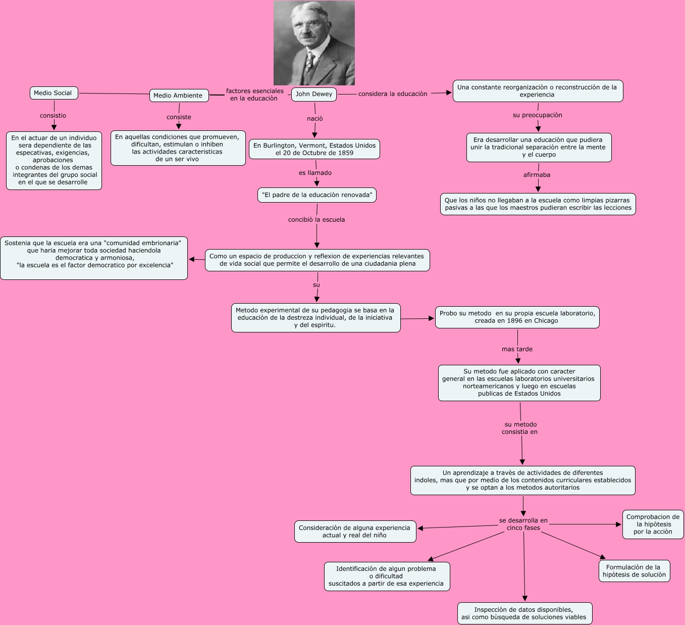 Este Cmap, tiene información relacionada con: mapa Dewey, Como un espacio de produccion y reflexion de experiencias relevantes de vida social que permite el desarrollo de una ciudadania plena su Metodo experimental de su pedagogia se basa en la educaciòn de la destreza individual, de la iniciativa y del espiritu., John Dewey naciò En Burlington, Vermont, Estados Unidos el 20 de Octubre de 1859, John Dewey considera la educaciòn Una constante reorganizaciòn o reconstrucciòn de la experiencia, Como un espacio de produccion y reflexion de experiencias relevantes de vida social que permite el desarrollo de una ciudadania plena ???? Sostenia que la escuela era una "comunidad embrionaria" que haria mejorar toda sociedad haciendola democratica y armoniosa, "la escuela es el factor democratico por excelencia", Su metodo fue aplicado con caracter general en las escuelas laboratorios universitarios norteamericanos y luego en escuelas publicas de Estados Unidos su metodo consistia en Un aprendizaje a travès de actividades de diferentes indoles, mas que por medio de los contenidos curriculares establecidos y se optan a los metodos autoritarios, Era desarrollar una educaciòn que pudiera unir la tradicional separaciòn entre la mente y el cuerpo afirmaba Que los niños no llegaban a la escuela como limpias pizarras pasivas a las que los maestros pudieran escribir las lecciones, Un aprendizaje a travès de actividades de diferentes indoles, mas que por medio de los contenidos curriculares establecidos y se optan a los metodos autoritarios se desarrolla en cinco fases Inspecciòn de datos disponibles, asi como bùsqueda de soluciones viables, "El padre de la educaciòn renovada" concibiò la escuela Como un espacio de produccion y reflexion de experiencias relevantes de vida social que permite el desarrollo de una ciudadania plena, En Burlington, Vermont, Estados Unidos el 20 de Octubre de 1859 es llamado "El padre de la educaciòn renovada", Probo su metodo en su propia escuela laboratorio, creada en 1896 en Chicago mas tarde Su metodo fue aplicado con caracter general en las escuelas laboratorios universitarios norteamericanos y luego en escuelas publicas de Estados Unidos, John Dewey factores esenciales en la educaciòn Medio Ambiente, Un aprendizaje a travès de actividades de diferentes indoles, mas que por medio de los contenidos curriculares establecidos y se optan a los metodos autoritarios se desarrolla en cinco fases Consideraciòn de alguna experiencia actual y real del niño, Un aprendizaje a travès de actividades de diferentes indoles, mas que por medio de los contenidos curriculares establecidos y se optan a los metodos autoritarios se desarrolla en cinco fases Identificaciòn de algun problema o dificultad suscitados a partir de esa experiencia, John Dewey factores esenciales en la educaciòn Medio Social, Un aprendizaje a travès de actividades de diferentes indoles, mas que por medio de los contenidos curriculares establecidos y se optan a los metodos autoritarios se desarrolla en cinco fases Comprobacion de la hipòtesis por la acciòn, Una constante reorganizaciòn o reconstrucciòn de la experiencia su preocupaciòn Era desarrollar una educaciòn que pudiera unir la tradicional separaciòn entre la mente y el cuerpo, Medio Social consistio En el actuar de un individuo sera dependiente de las especativas, exigencias, aprobaciones o condenas de los demas integrantes del grupo social en el que se desarrolle, Medio Ambiente consiste En aquellas condiciones que promueven, dificultan, estimulan o inhiben las actividades caracteristicas de un ser vivo, Metodo experimental de su pedagogia se basa en la educaciòn de la destreza individual, de la iniciativa y del espiritu. ???? Probo su metodo en su propia escuela laboratorio, creada en 1896 en Chicago, Un aprendizaje a travès de actividades de diferentes indoles, mas que por medio de los contenidos curriculares establecidos y se optan a los metodos autoritarios se desarrolla en cinco fases Formulaciòn de la hipòtesis de soluciòn