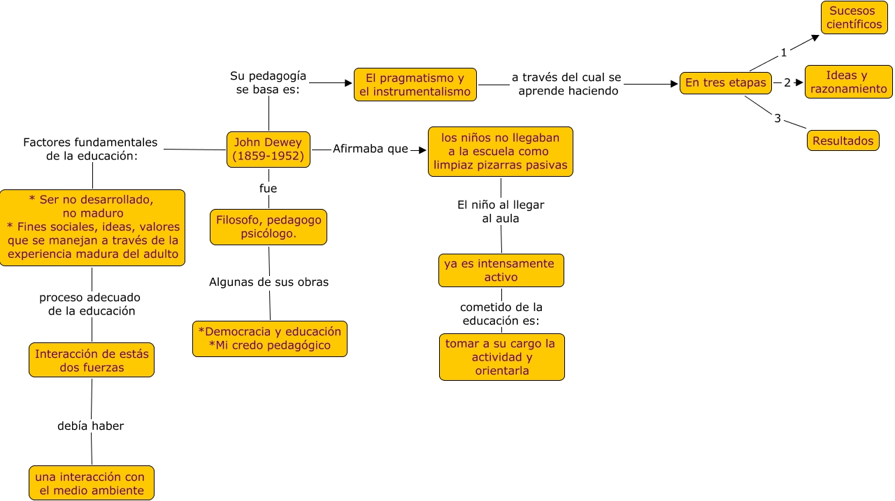 Este Cmap, tiene información relacionada con: Dewey.cmap, ya es intensamente activo cometido de la educación es: tomar a su cargo la actividad y orientarla, En tres etapas 2 Ideas y razonamiento, Interacción de estás dos fuerzas debía haber una interacción con el medio ambiente, El pragmatismo y el instrumentalismo a través del cual se aprende haciendo En tres etapas, En tres etapas 1 Sucesos científicos, Filosofo, pedagogo psicólogo. Algunas de sus obras *Democracia y educación *Mi credo pedagógico, los niños no llegaban a la escuela como limpiaz pizarras pasivas El niño al llegar al aula ya es intensamente activo, En tres etapas 3 Resultados, John Dewey (1859-1952) Factores fundamentales de la educación: * Ser no desarrollado, no maduro * Fines sociales, ideas, valores que se manejan a través de la experiencia madura del adulto, * Ser no desarrollado, no maduro * Fines sociales, ideas, valores que se manejan a través de la experiencia madura del adulto proceso adecuado de la educación Interacción de estás dos fuerzas, John Dewey (1859-1952) Su pedagogía se basa es: El pragmatismo y el instrumentalismo, John Dewey (1859-1952) fue Filosofo, pedagogo psicólogo., John Dewey (1859-1952) Afirmaba que los niños no llegaban a la escuela como limpiaz pizarras pasivas