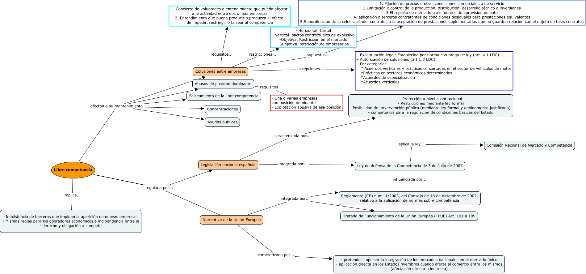 Este Cmap, tiene información relacionada con: Mapa conceptual Escenario 4 corrección, Abusos de posición dominante requisitos - Una o varias empresas con posición dominante - Explotación abusiva de esa posición, Colusiones entre empresas supuestos... 1. Fijación de precios u otras condiciones comerciales o de servicio 2.Limitación o control de la producción, distribución, desarrollo técnico o inversiones 3.El reparto de mercado o als fuentes de aprovisionamiento 4. aplicación a terceros contratantes de condiciones desiguales para prestaciones equivalentes 5.Subordinación de la celebraciónde contratos a la aceptación de prestaciones suplementarias que no guarden relación con el objeto de tales contratos, Libre competencia afectan a su mantenimiento Concentraciones, Libre competencia implica... -Inexistencia de barreras que impidan la aparición de nuevas empresas - Mismas reglas para los operadores economicos e indipendencia entre si - derecho y obligación a competir, Legislación nacional española integrada por... Ley de defensa de la Competencia de 3 de Julio de 2007, Normativa de la Unión Europea integrada por... Reglamento (CE) núm. 1/2003, del Consejo de 16 de diciembre de 2002, relativo a la aplicación de normas sobre competencia, Colusiones entre empresas restricciones... - Horizontal. Cártel - Vertical. pactos contractuales de explusiva -Objetiva. Restricción en el mercado -Subjetiva.Retsricción de empresarios, Colusiones entre empresas excepciones... - Exceptuación legal: Establecida por norma con rango de ley (art. 4.1 LDC) - Autorización de colusiones (art.1.3 LDC) - Por categoria: * Acuerdos verticales y prácticas concertadas en el sector de vehículos de motor *Prácticas en sectores económicos determinados *Acuerdos de especialización *Acuerdos verticales, Colusiones entre empresas requisitos... 1. Concierto de voluntades o entendimiento que pueda afectar a la actividad entre dos o más empresas 2. Entendimiento que pueda producir o produzca el efecto de impedir, restringir o falsear al competencia, Normativa de la Unión Europea caracterizada por... - pretender impulsar la integración de los mercados nacionales en el mercado único - aplicación directa en los Estados miembros cuando afecte al comercio entre los mismos (afectación directa o indirecta), Libre competencia regulada por... Normativa de la Unión Europea, Ley de defensa de la Competencia de 3 de Julio de 2007 influenciada por... Reglamento (CE) núm. 1/2003, del Consejo de 16 de diciembre de 2002, relativo a la aplicación de normas sobre competencia, Libre competencia regulada por... Legislación nacional española, Libre competencia afectan a su mantenimiento Abusos de posición dominante, Ley de defensa de la Competencia de 3 de Julio de 2007 aplica la ley... Comisión Nacional de Mercado y Competencia, Libre competencia afectan a su mantenimiento Falseamiento de la libre competencia, Libre competencia afectan a su mantenimiento Ayudas públicas, Libre competencia regulada por... Legislación nacional española, Normativa de la Unión Europea integrada por... Tratado de Funcionamiento de la Unión Europea (TFUE) Art. 101 a 109, Legislación nacional española caracterizada por... - Protección a nivel cosntitucional - Restricciones mediante ley formal -Posibilidad de intyervención pública (mediante ley formal y debidamente justificado) - competencia para la regulación de condiciones básicas del Estado