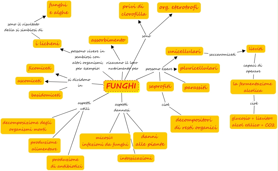 Questa Cmap, creata con IHMC CmapTools, contiene informazioni relative a: funghi, FUNGHI possono essere unicellulari, FUNGHI possono essere saprofiti, FUNGHI sono org. eterotrofi, FUNGHI ricavano il loro nutrimento per assorbimento, FUNGHI sono privi di clorofilla, FUNGHI aspetti utili produzione di antibiotici, FUNGHI si dividono in ficomiceti, unicellulari saccaromiceti lieviti, FUNGHI si dividono in ascomiceti, saprofiti cioè decompositori di resti organici, FUNGHI aspetti utili produzione alimentare, FUNGHI possono vivere in sembiosi con altri organismi; per esempio: i licheni, lieviti capaci di operare la fermentazione alcolica, FUNGHI possono essere parassiti, FUNGHI si dividono in basidomiceti, FUNGHI aspetti utili decomposizione degli organismi morti, FUNGHI aspetti dannosi intossicazioni, la fermentazione alcolica cioè glucosio + lievito= alcol etilico + CO2, FUNGHI aspetti dannosi micosi= infezioni da funghi, FUNGHI aspetti dannosi danni alle piante