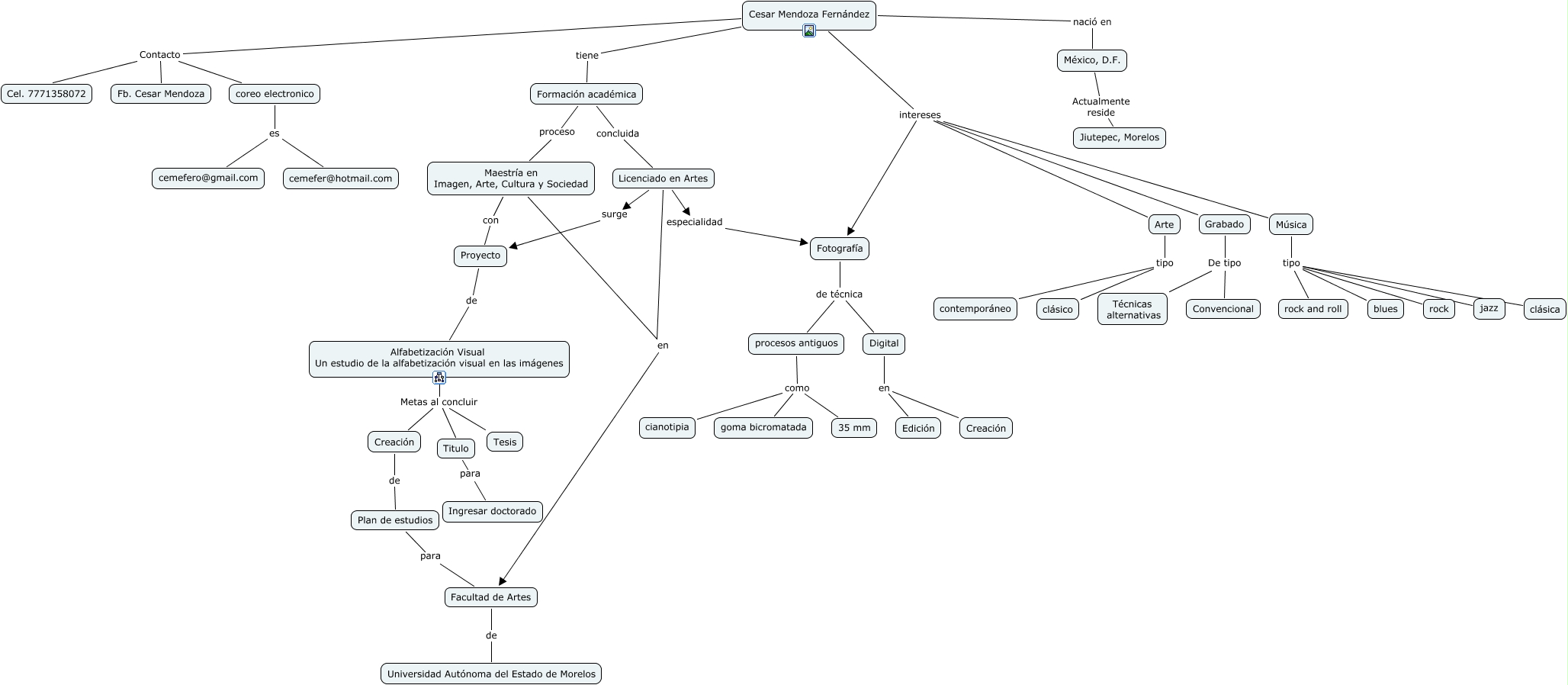 Este Cmap, tiene información relacionada con: 1Cesar, Maestría en Imagen, Arte, Cultura y Sociedad en Facultad de Artes, Alfabetización Visual Un estudio de la alfabetización visual en las imágenes Metas al concluir Titulo, Cesar Mendoza Fernández intereses Arte, Cesar Mendoza Fernández intereses Música, coreo electronico es cemefer@hotmail.com, Grabado De tipo Técnicas alternativas, Plan de estudios para Facultad de Artes, Facultad de Artes de Universidad Autónoma del Estado de Morelos, Formación académica concluida Licenciado en Artes, Cesar Mendoza Fernández tiene Formación académica, Música tipo rock and roll, Música tipo jazz, Cesar Mendoza Fernández Contacto Fb. Cesar Mendoza, Alfabetización Visual Un estudio de la alfabetización visual en las imágenes Metas al concluir Creación, Arte tipo contemporáneo, Cesar Mendoza Fernández intereses Fotografía, Fotografía de técnica procesos antiguos, Titulo para Ingresar doctorado, Alfabetización Visual Un estudio de la alfabetización visual en las imágenes Metas al concluir Tesis, procesos antiguos como goma bicromatada