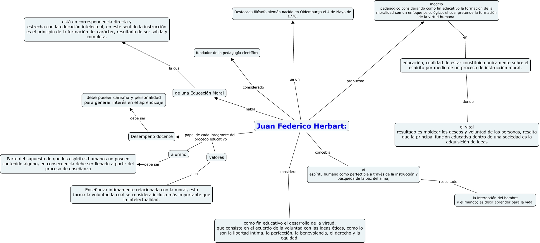 Este Cmap, tiene información relacionada con: herbart, al espíritu humano como perfectible a través de la instrucción y búsqueda de la paz del alma; rescultado la interacción del hombre y el mundo; es decir aprender para la vida., Juan Federico Herbart: propuesta modelo pedagógico considerando como fin educativo la formación de la moralidad con un enfoque psicológico, el cual pretende la formación de la virtud humana, Juan Federico Herbart: papel de cada integrante del procedo educativo valores, Juan Federico Herbart: papel de cada integrante del procedo educativo Desempeño docente, Juan Federico Herbart: considerado fundador de la pedagogía científica, Juan Federico Herbart: considera como fin educativo el desarrollo de la virtud, que consiste en el acuerdo de la voluntad con las ideas éticas, como lo son la libertad íntima, la perfección, la benevolencia, el derecho y la equidad., Desempeño docente debe ser debe poseer carisma y personalidad para generar interés en el aprendizaje, valores son Enseñanza íntimamente relacionada con la moral, esta forma la voluntad la cual se considera incluso más importante que la intelectualidad., Juan Federico Herbart: habla de una Educación Moral, Juan Federico Herbart: concebía al espíritu humano como perfectible a través de la instrucción y búsqueda de la paz del alma;, Juan Federico Herbart: fue un Destacado filósofo alemán nacido en Oldemburgo el 4 de Mayo de 1776., de una Educación Moral la cual está en correspondencia directa y estrecha con la educación intelectual, en este sentido la instrucción es el principio de la formación del carácter, resultado de ser sólida y completa., alumno debe ser Parte del supuesto de que los espíritus humanos no poseen contenido alguno, en consecuencia debe ser llenado a partir del proceso de enseñanza, Juan Federico Herbart: papel de cada integrante del procedo educativo alumno, modelo pedagógico considerando como fin educativo la formación de la moralidad con un enfoque psicológico, el cual pretende la formación de la virtud humana en educación, cualidad de estar constituida únicamente sobre el espíritu por medio de un proceso de instrucción moral., educación, cualidad de estar constituida únicamente sobre el espíritu por medio de un proceso de instrucción moral. donde el vital resultado es moldear los deseos y voluntad de las personas, resalta que la principal función educativa dentro de una sociedad es la adquisición de ideas