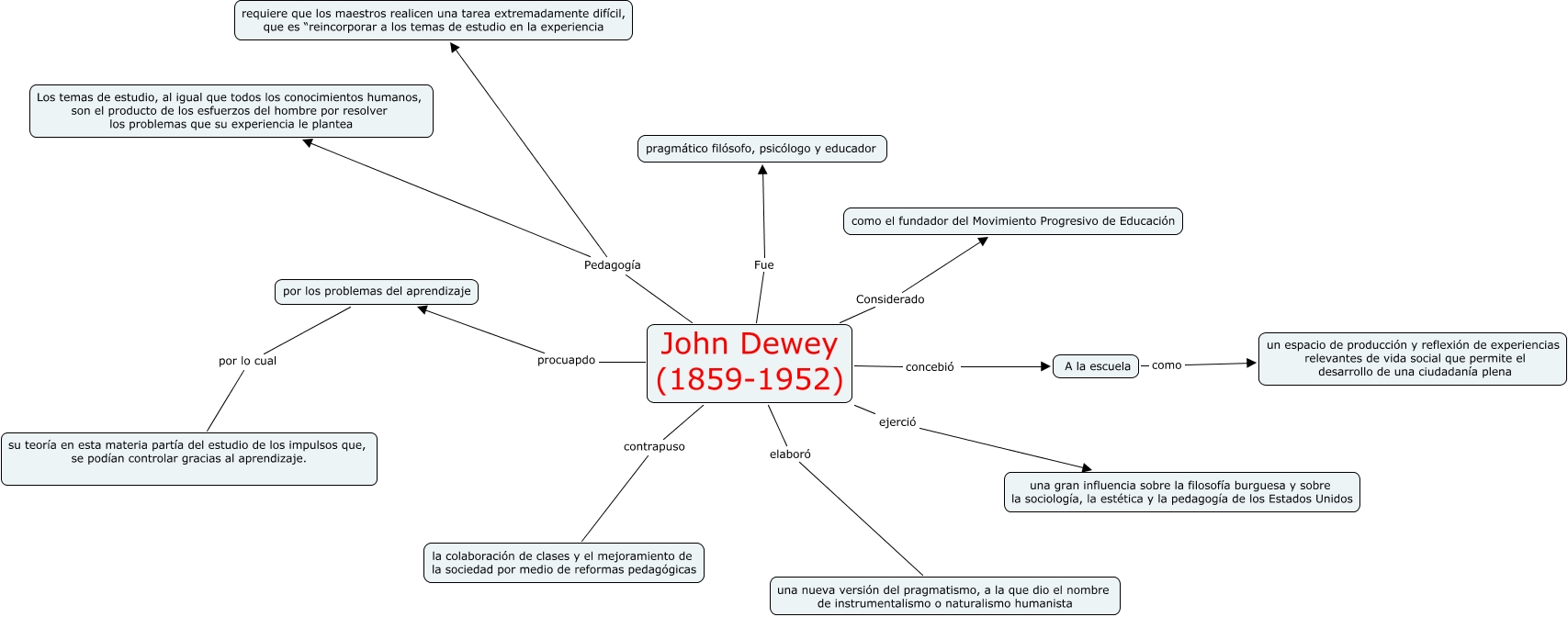 Este Cmap, tiene información relacionada con: Dewey, John Dewey (1859-1952) ejerció una gran influencia sobre la filosofía burguesa y sobre la sociología, la estética y la pedagogía de los Estados Unidos, A la escuela como un espacio de producción y reflexión de experiencias relevantes de vida social que permite el desarrollo de una ciudadanía plena, John Dewey (1859-1952) Pedagogía Los temas de estudio, al igual que todos los conocimientos humanos, son el producto de los esfuerzos del hombre por resolver los problemas que su experiencia le plantea, John Dewey (1859-1952) contrapuso la colaboración de clases y el mejoramiento de la sociedad por medio de reformas pedagógicas, John Dewey (1859-1952) procuapdo por los problemas del aprendizaje, John Dewey (1859-1952) elaboró una nueva versión del pragmatismo, a la que dio el nombre de instrumentalismo o naturalismo humanista, John Dewey (1859-1952) Pedagogía requiere que los maestros realicen una tarea extremadamente difícil, que es “reincorporar a los temas de estudio en la experiencia, por los problemas del aprendizaje por lo cual su teoría en esta materia partía del estudio de los impulsos que, se podían controlar gracias al aprendizaje., John Dewey (1859-1952) concebió A la escuela, John Dewey (1859-1952) Fue pragmático filósofo, psicólogo y educador, John Dewey (1859-1952) Considerado como el fundador del Movimiento Progresivo de Educación