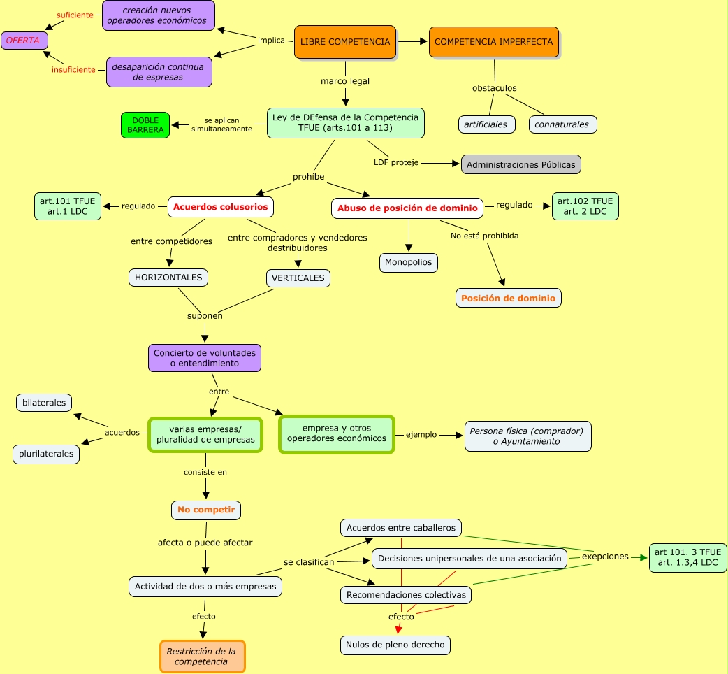 Este Cmap, tiene información relacionada con: 3 Libre competencia corrección, COMPETENCIA IMPERFECTA obstaculos artificiales, Actividad de dos o más empresas se clasifican Decisiones unipersonales de una asociación, Abuso de posición de dominio ???? Monopolios, Ley de DEfensa de la Competencia TFUE (arts.101 a 113) se aplican simultaneamente DOBLE BARRERA, Actividad de dos o más empresas efecto Restricción de la competencia, Ley de DEfensa de la Competencia TFUE (arts.101 a 113) LDF proteje Administraciones Públicas, Acuerdos entre caballeros efecto Decisiones unipersonales de una asociación, LIBRE COMPETENCIA marco legal Ley de DEfensa de la Competencia TFUE (arts.101 a 113), HORIZONTALES suponen Concierto de voluntades o entendimiento, LIBRE COMPETENCIA ???? COMPETENCIA IMPERFECTA, empresa y otros operadores económicos ejemplo Persona física (comprador) o Ayuntamiento, varias empresas/ pluralidad de empresas consiste en No competir, Abuso de posición de dominio No está prohibida Posición de dominio, Decisiones unipersonales de una asociación exepciones art 101. 3 TFUE art. 1.3,4 LDC, varias empresas/ pluralidad de empresas acuerdos plurilaterales, LIBRE COMPETENCIA implica creación nuevos operadores económicos, varias empresas/ pluralidad de empresas acuerdos bilaterales, Acuerdos colusorios entre competidores HORIZONTALES, Recomendaciones colectivas exepciones art 101. 3 TFUE art. 1.3,4 LDC, desaparición continua de espresas insuficiente OFERTA