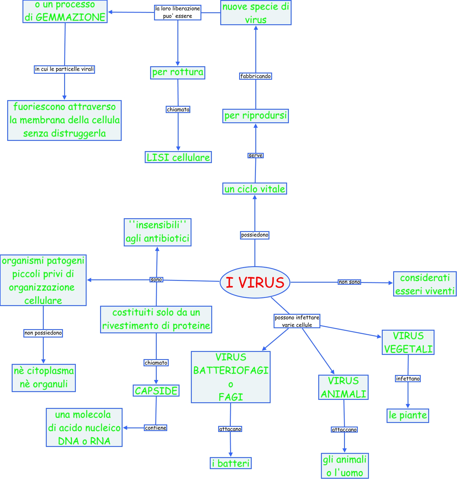 Questa Cmap, creata con IHMC CmapTools, contiene informazioni relative a: i virus, o un processo di GEMMAZIONE in cui le particelle virali fuoriescono attraverso la membrana della cellula senza distruggerla, I VIRUS sono organismi patogeni piccoli privi di organizzazione cellulare, nuove specie di virus la loro liberazione puo' essere per rottura, VIRUS VEGETALI infettano le piante, costituiti solo da un rivestimento di proteine chiamato CAPSIDE, per riprodursi fabbricando nuove specie di virus, I VIRUS possono infettare varie cellule VIRUS VEGETALI, I VIRUS sono costituiti solo da un rivestimento di proteine, VIRUS BATTERIOFAGI o FAGI attacano i batteri, I VIRUS possono infettare varie cellule VIRUS ANIMALI, nuove specie di virus la loro liberazione puo' essere o un processo di GEMMAZIONE, per rottura chiamata LISI cellulare, CAPSIDE contiene una molecola di acido nucleico DNA o RNA, I VIRUS possiedono un ciclo vitale, organismi patogeni piccoli privi di organizzazione cellulare non possiedono nè citoplasma nè organuli, I VIRUS non sono considerati esseri viventi, VIRUS ANIMALI attaccano gli animali o l'uomo, un ciclo vitale serve per riprodursi, I VIRUS possono infettare varie cellule VIRUS BATTERIOFAGI o FAGI, I VIRUS sono ''insensibili'' agli antibiotici