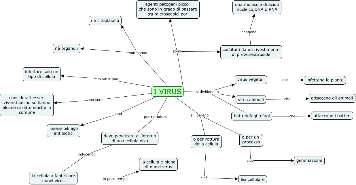 Questa Cmap, creata con IHMC CmapTools, contiene informazioni relative a: i virus, I VIRUS sono costituiti da un rivestimento di proteine,capside, virus vegetali che infettano le piante, I VIRUS si liberano o per rottura della cellula, deve penetrare all'interno di una cellula viva inducendo la cellula a fabbricare nuovi virus, I VIRUS si dividono in batteriofagi o fagi, I VIRUS un virus può infettare solo un tipo di cellula, o per rottura della cellula cioè lisi cellulare, I VIRUS non hanno nè organuli, I VIRUS si dividono in virus animali, costituiti da un rivestimento di proteine,capside contiene una molecola di acido nucleico,DNA o RNA, I VIRUS si liberano o per un processo, la cellula a fabbricare nuovi virus in poco tempo la cellula e piena di nuovi virus, I VIRUS per riprodursi deve penetrare all'interno di una cellula viva, batteriofagi o fagi che attaccano i batteri, I VIRUS si dividono in virus vegetali, I VIRUS non sono considerati esseri viventi anche se hanno alcune caratteristiche in comune, I VIRUS sono insensibili agli antibiotici, I VIRUS non hanno nè citoplasma, virus animali che attaccano gli animali, I VIRUS sono agenti patogeni piccoli che sono in grado di passare tra microscopici pori