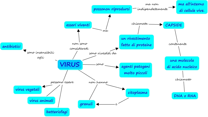 Questa Cmap, creata con IHMC CmapTools, contiene informazioni relative a: i virus, VIRUS sono insensibili agli antibiotici, possonon riprodursi ma non indipendetemente ma all'interno di cellule vive., VIRUS non hanno citoplasma, VIRUS possono essere batteriofagi, VIRUS possono essere virus vegetali, una molecola di acido nucleico chiamato DNA o RNA, esseri viventi ma possonon riprodursi, CAPSIDE contenente una molecola di acido nucleico, VIRUS sono agenti patogeni molto piccoli, citoplasma e granuli, granuli non hanno citoplasma, VIRUS non sono considerati esseri viventi, VIRUS sono rivestiti da un rivestimento fatto di proteine, VIRUS possono essere virus animali, un rivestimento fatto di proteine chiamata CAPSIDE