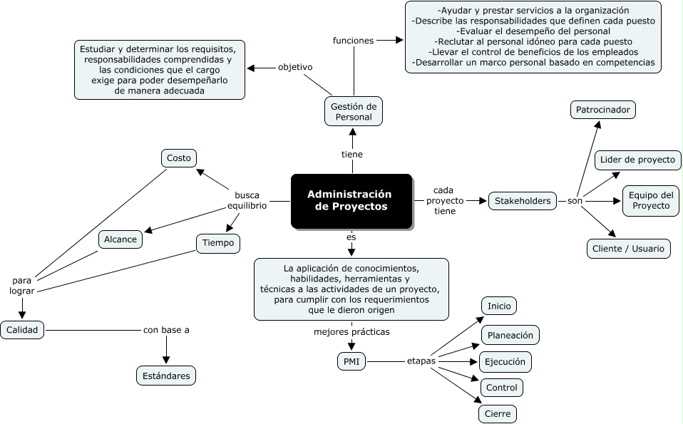Este Cmap, tiene información relacionada con: 140333 Clase 7 (Administración de Proyectos), Administración de Proyectos busca equilibrio Alcance, Calidad con base a Estándares, PMI etapas Inicio, Stakeholders son Cliente / Usuario, Tiempo para lograr Calidad, PMI etapas Planeación, Gestión de Personal objetivo Estudiar y determinar los requisitos, responsabilidades comprendidas y las condiciones que el cargo exige para poder desempeñarlo de manera adecuada, Alcance para lograr Calidad, Gestión de Personal funciones -Ayudar y prestar servicios a la organización -Describe las responsabilidades que definen cada puesto -Evaluar el desempeño del personal -Reclutar al personal idóneo para cada puesto -Llevar el control de beneficios de los empleados -Desarrollar un marco personal basado en competencias, Administración de Proyectos tiene Gestión de Personal, Administración de Proyectos es La aplicación de conocimientos, habilidades, herramientas y técnicas a las actividades de un proyecto, para cumplir con los requerimientos que le dieron origen, Stakeholders son Equipo del Proyecto, La aplicación de conocimientos, habilidades, herramientas y técnicas a las actividades de un proyecto, para cumplir con los requerimientos que le dieron origen mejores prácticas PMI, PMI etapas Ejecución, Administración de Proyectos busca equilibrio Costo, Stakeholders son Patrocinador, Administración de Proyectos busca equilibrio Tiempo, PMI etapas Cierre, Costo para lograr Calidad, PMI etapas Control