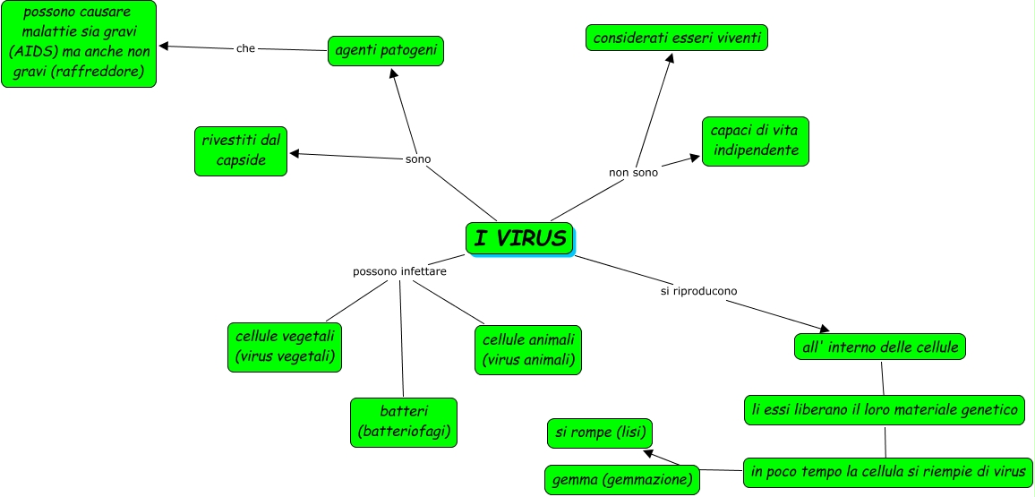 Questa Cmap, creata con IHMC CmapTools, contiene informazioni relative a: virus, I VIRUS sono agenti patogeni, I VIRUS possono infettare cellule animali (virus animali), I VIRUS possono infettare cellule vegetali (virus vegetali), I VIRUS non sono capaci di vita indipendente, in poco tempo la cellula si riempie di virus e gemma (gemmazione), in poco tempo la cellula si riempie di virus e si rompe (lisi), li essi liberano il loro materiale genetico ???? in poco tempo la cellula si riempie di virus, all' interno delle cellule ???? li essi liberano il loro materiale genetico, I VIRUS non sono considerati esseri viventi, I VIRUS possono infettare batteri (batteriofagi), I VIRUS sono rivestiti dal capside, agenti patogeni che possono causare malattie sia gravi (AIDS) ma anche non gravi (raffreddore), I VIRUS si riproducono all' interno delle cellule