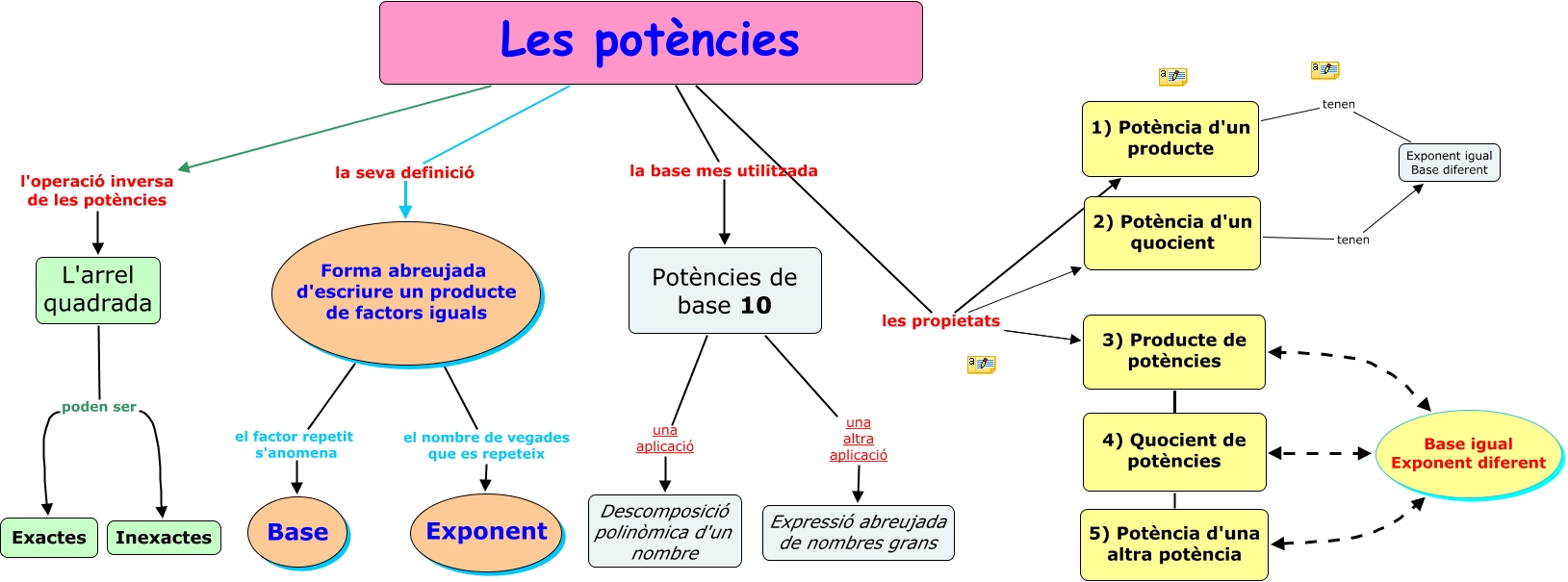 Aquest mapa conceptual conté informació relacionada amb: Correccions Activitat3 Les potències, Les potències l'operació inversa de les potències L'arrel quadrada, 4) Quocient de potències 5) Potència d'una altra potència, Forma abreujada d'escriure un producte de factors iguals el factor repetit s'anomena Base, Forma abreujada d'escriure un producte de factors iguals el nombre de vegades que es repeteix Exponent, L'arrel quadrada poden ser Inexactes, Les potències la seva definició Forma abreujada d'escriure un producte de factors iguals, 1) Potència d'un producte tenen Exponent igual Base diferent, Potències de base 10 una aplicació Descomposició polinòmica d'un nombre, 2) Potència d'un quocient tenen Exponent igual Base diferent, Les potències les propietats 3) Producte de potències, Les potències les propietats 1) Potència d'un producte, Les potències les propietats 2) Potència d'un quocient, 3) Producte de potències Base igual Exponent diferent 4) Quocient de potències, Les potències la base mes utilitzada Potències de base 10, 3) Producte de potències Base igual Exponent diferent 5) Potència d'una altra potència, 3) Producte de potències 4) Quocient de potències, Potències de base 10 una altra aplicació Expressió abreujada de nombres grans, Les potències les propietats 3) Producte de potències, L'arrel quadrada poden ser Exactes