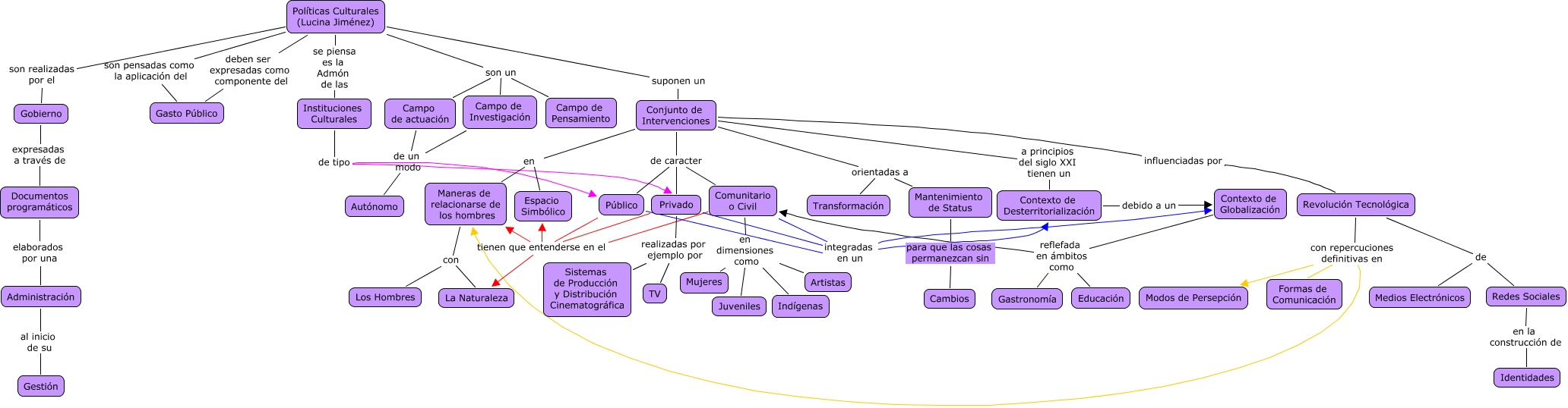 Este Cmap, tiene información relacionada con: Políticas Culturales, Público tienen que entenderse en el Espacio Simbólico, Público integradas en un Contexto de Desterritorialización, Conjunto de Intervenciones de caracter Público, Contexto de Globalización reflefada en ámbitos como Educación, Comunitario o Civil tienen que entenderse en el Espacio Simbólico, Revolución Tecnológica con repercuciones definitivas en Maneras de relacionarse de los hombres, Comunitario o Civil en dimensiones como Juveniles, Redes Sociales en la construcción de Identidades, Mantenimiento de Status para que las cosas permanezcan sin Cambios, Maneras de relacionarse de los hombres con Los Hombres, Contexto de Globalización reflefada en ámbitos como Comunitario o Civil, Comunitario o Civil en dimensiones como Mujeres, Público integradas en un Contexto de Globalización, Maneras de relacionarse de los hombres con La Naturaleza, Revolución Tecnológica de Redes Sociales, Privado tienen que entenderse en el Espacio Simbólico, Conjunto de Intervenciones en Espacio Simbólico, Revolución Tecnológica de Medios Electrónicos, Políticas Culturales (Lucina Jiménez) deben ser expresadas como componente del Gasto Público, Conjunto de Intervenciones en Maneras de relacionarse de los hombres