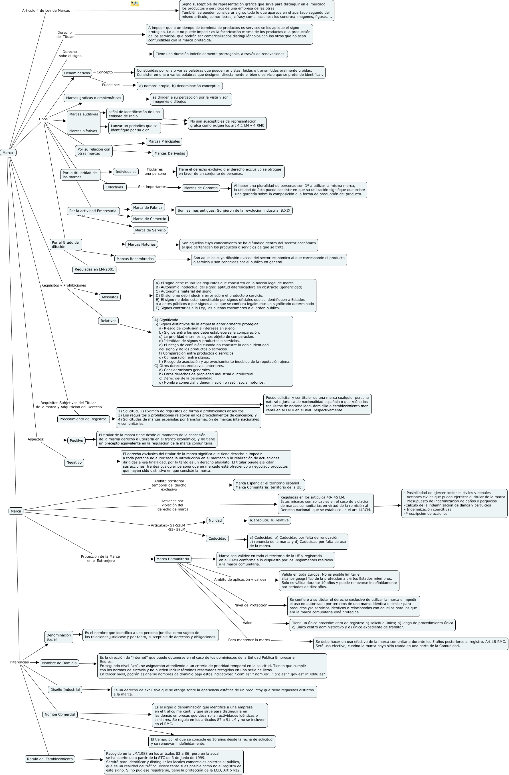 Este Cmap, tiene información relacionada con: Cas 8, Marca Acciones por violación del derecho de marca Reguladas en los articulos 40- 45 LM. Éstas mismas son aplicables en el caso de violación de marcas comunitarias en virtud de la remisión al Derecho nacional que se establece en el art 14RCM., Marcas graficas o emblemáticas ???? se dirigen a su percepción por la vista y son imágenes o dibujos, Positivo ???? El titular de la marca tiene desde el momento de la concesión de la misma derecho a utilizarla en el tráfico económico, y no tiene un precepto equivalente en la regulación de la marca comunitaria., Absolutos ???? A) El signo debe reunir los requisitos que concurren en la noción legal de marca B) Autonomía intelectual del signo: aptitud diferenciadora en abstracto (genericidad) C) Autonomía material del signo. D) El signo no deb inducir a error sobre el producto o servicio. E) El signo no debe estar constituido por signos oficiales que se identifiquen a Estados o a entes públicos o por signos a los que se confiera legalmente un significado determinado F) Signos contrarios a la Ley, las buenas costumbres o el orden público., Relativos ???? A) Significado B) Signos distintivos de la empresa anteriormente protegida: a) Riesgo de confusión e intereses en juego. b) Signos entre los que debe establecerse la comparación. c) La prioridad entre los signos objeto de comparación. d) Identidad de signos y productos o servicios. e) El riesgo de confusión cuando no concurre la doble identidad del signo y de los productos o servicios. f) Comparación entre productos o servicios. g) Comparación entre signos. h) Riesgo de asociación y aprovechamiento indebido de la reputación ajena. C) Otros derechos exclusivos anteriores. a) Consideraciones generales. b) Otros derechos de propiedad industrial o intelectual. c) Derechos de la personalidad. d) Nombre comercial y denominación o razón social notorios., Marca Tipos Por su relación con otras marcas, Marca ???? Marca, Denominativas Puede ser: a) nombre propio; b) denominación conceptual, Marca Articulos:- 51-52LM -55- 58LM Nulidad, Individuales Titular es una persona Tiene el derecho excluivo o el derecho exclusivo se otrogue en favor de un conjunto de personas., Marca Aspectos: Negativo, Rotulo del Establecimiento ???? Recogido en la LM/1988 en los aritculos 82 a 86; pero en la acual se ha suprimido a partir de la STC de 3 de junio de 1999. Servirá para identificar y distinguir los locales comerciales abiertos al público, que es un realidad del tráfico, existe tanto si es posible como no el registro de este signo. Si no pudiese registrarse, tiene la protección de la LCD, Art 6 y12., Por el Grado de difusión ???? Marcas Notorias, Marca Requisitos Subjetivos del Titular de la marca y Adquisición del Derecho Puede solicitar y ser titular de una marca cualquier persona natural o juridica de nacionalidad española o que reúna los requisitos de nacionalidad, domicilio o establecimiento mer- cantil en al LM o en el RMC respectivamente., Marca Comunitaria ???? Marca con validez en todo el territorio de la UE y registrada en el OAMI conforme a lo dispuesto por los Reglamentos realtivos a la marca comunitaria., Por su relación con otras marcas ???? Marcas Principales, Colectivas Son importantes Marcas de Garantia, Marcas auditivas Marcas olfativas ???? Lanzar un periódico que se identifique por su olor, Marca Tipos Marcas auditivas Marcas olfativas, Marcas de Garantia ???? Al haber una pluralidad de personas con Dº a utilizar la misma marca, la utilidad de ésta puede consistir en que su utilización signifique que existe una garantía sobre la composición o la forma de producción del producto.