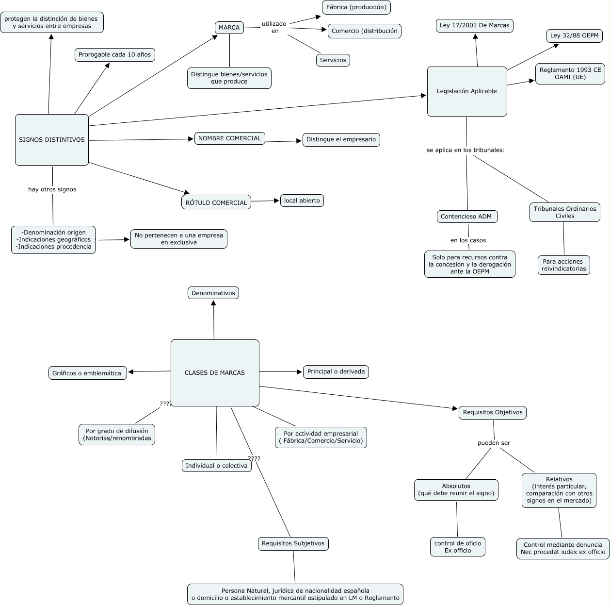 Este Cmap, tiene información relacionada con: Escenari CEDO,SEDÓ, CLASES DE MARCAS ???? Requisitos Objetivos, CLASES DE MARCAS ???? Individual o colectiva, SIGNOS DISTINTIVOS hay otros signos -Denominación origen -Indicaciones geográficos -Indicaciones procedencia, CLASES DE MARCAS ???? Requisitos Subjetivos, -Denominación origen -Indicaciones geográficos -Indicaciones procedencia ???? No pertenecen a una empresa en exclusiva, Legislación Aplicable se aplica en los tribunales: Tribunales Ordinarios Civiles, CLASES DE MARCAS ???? Por actividad empresarial ( Fábrica/Comercio/Servicio), SIGNOS DISTINTIVOS ???? NOMBRE COMERCIAL, Legislación Aplicable ???? Ley 17/2001 De Marcas, SIGNOS DISTINTIVOS ???? Legislación Aplicable, Legislación Aplicable ???? Reglamento 1993 CE OAMI (UE), SIGNOS DISTINTIVOS ???? Prorogable cada 10 años, Legislación Aplicable ???? Ley 32/88 OEPM, Legislación Aplicable se aplica en los tribunales: Contencioso ADM, Relativos (interés particular, comparación con otros signos en el mercado) ???? Control mediante denuncia Nec procedat iudex ex officio, SIGNOS DISTINTIVOS ???? RÓTULO COMERCIAL, Requisitos Objetivos pueden ser Absolutos (qué debe reunir el signo), SIGNOS DISTINTIVOS ???? MARCA, MARCA ???? Distingue bienes/servicios que produce, Contencioso ADM en los casos Solo para recursos contra la concesión y la derogación ante la OEPM