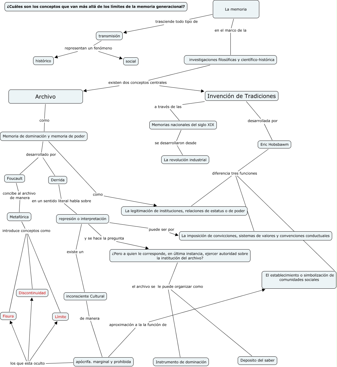Este Cmap, tiene información relacionada con: 4.Límites de la memoria generacional, ¿Pero a quien le corresponde, en última instancia, ejercer autoridad sobre la institución del archivo? el archivo se le puede organizar como Instrumento de dominación, Memoria de dominación y memoria de poder desarrollado por Foucault, represión o interpretación puede ser por La imposición de convicciones, sistemas de valores y convenciones conductuales, Derrida en un sentido literal habla sobre represión o interpretación, Foucault concibe al archivo de manera Metafórica, Metafórica introduce conceptos como Discontinuidad, transmisión representan un fenómeno social, Memorias nacionales del siglo XIX se desarrollaron desde La revolución industrial, Metafórica introduce conceptos como Fisura, Invención de Tradiciones desarrollada por Eric Hobsbawm, apócrifa. marginal y prohibida aproximación a la la función de El establecimiento o simbolización de comunidades sociales, Archivo como Memoria de dominación y memoria de poder, Memoria de dominación y memoria de poder como La legitimación de instituciones, relaciones de estatus o de poder, investigaciones filosóficas y científico-histórica existen dos conceptos centrales Archivo, Eric Hobsbawm diferencia tres funciones La legitimación de instituciones, relaciones de estatus o de poder, represión o interpretación y se hace la pregunta ¿Pero a quien le corresponde, en última instancia, ejercer autoridad sobre la institución del archivo?, La memoria en el marco de la investigaciones filosóficas y científico-histórica, apócrifa. marginal y prohibida los que esta oculto Límite, inconsciente Cultural de manera apócrifa. marginal y prohibida, Eric Hobsbawm diferencia tres funciones La imposición de convicciones, sistemas de valores y convenciones conductuales