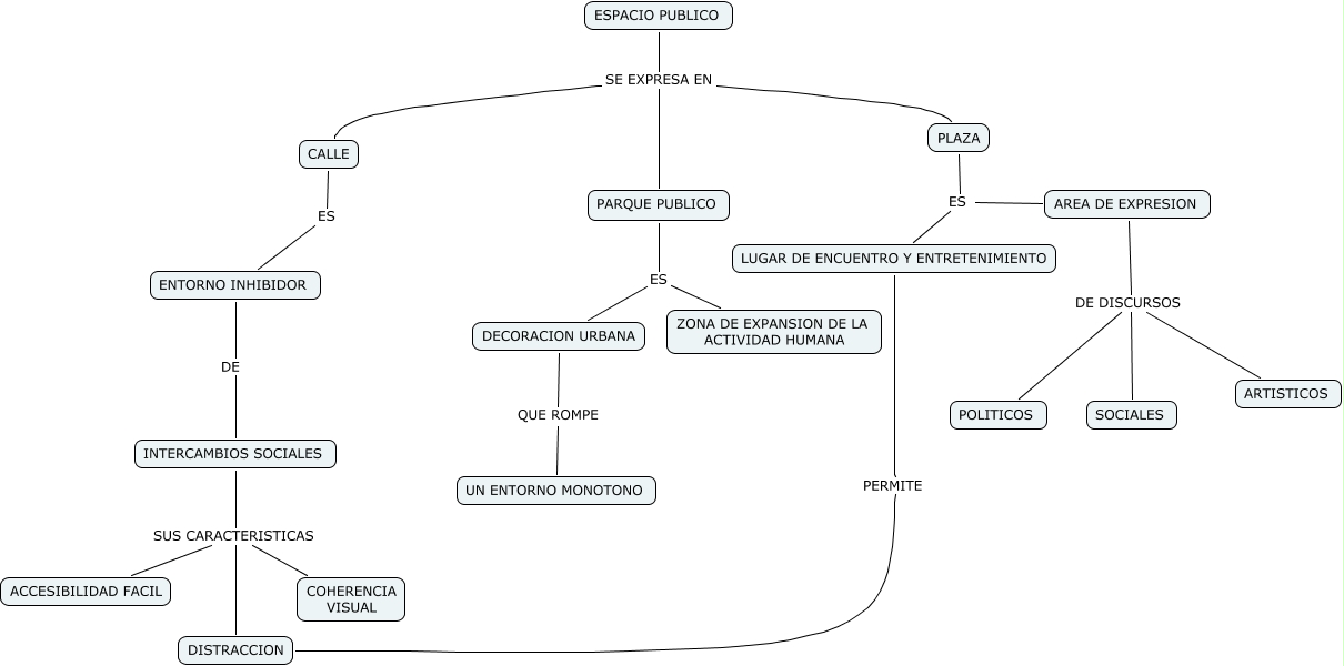 Este Cmap, tiene información relacionada con: ESPACIO PUBLICO, INTERCAMBIOS SOCIALES SUS CARACTERISTICAS ACCESIBILIDAD FACIL, ESPACIO PUBLICO SE EXPRESA EN PARQUE PUBLICO, ENTORNO INHIBIDOR DE INTERCAMBIOS SOCIALES, DECORACION URBANA QUE ROMPE UN ENTORNO MONOTONO, LUGAR DE ENCUENTRO Y ENTRETENIMIENTO PERMITE DISTRACCION, AREA DE EXPRESION DE DISCURSOS SOCIALES, PARQUE PUBLICO ES DECORACION URBANA, AREA DE EXPRESION DE DISCURSOS ARTISTICOS, PLAZA ES AREA DE EXPRESION, CALLE ES ENTORNO INHIBIDOR, ESPACIO PUBLICO SE EXPRESA EN PLAZA, ESPACIO PUBLICO SE EXPRESA EN CALLE, AREA DE EXPRESION DE DISCURSOS POLITICOS, PARQUE PUBLICO ES ZONA DE EXPANSION DE LA ACTIVIDAD HUMANA, INTERCAMBIOS SOCIALES SUS CARACTERISTICAS DISTRACCION, INTERCAMBIOS SOCIALES SUS CARACTERISTICAS COHERENCIA VISUAL, PLAZA ES LUGAR DE ENCUENTRO Y ENTRETENIMIENTO