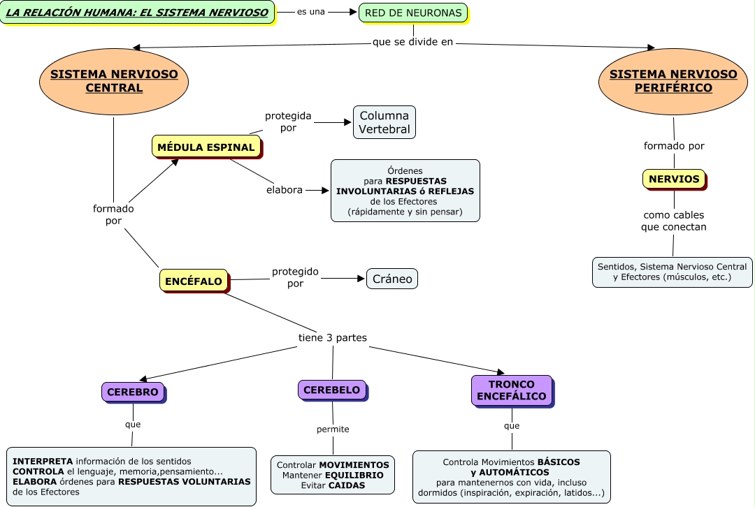 Este Cmap, tiene información relacionada con: LA RELACIÓN HUMANA - EL SISTEMA NERVIOSO, SISTEMA NERVIOSO CENTRAL formado por ENCÉFALO, SISTEMA NERVIOSO CENTRAL formado por MÉDULA ESPINAL, MÉDULA ESPINAL elabora Órdenes para RESPUESTAS INVOLUNTARIAS ó REFLEJAS de los Efectores (rápidamente y sin pensar), CEREBELO permite Controlar MOVIMIENTOS Mantener EQUILIBRIO Evitar CAIDAS, LA RELACIÓN HUMANA: EL SISTEMA NERVIOSO es una RED DE NEURONAS, TRONCO ENCEFÁLICO que Controla Movimientos BÁSICOS y AUTOMÁTICOS para mantenernos con vida, incluso dormidos (inspiración, expiración, latidos...), ENCÉFALO tiene 3 partes CEREBELO, RED DE NEURONAS que se divide en SISTEMA NERVIOSO CENTRAL, ENCÉFALO tiene 3 partes CEREBRO, ENCÉFALO tiene 3 partes TRONCO ENCEFÁLICO, ENCÉFALO protegido por Cráneo, RED DE NEURONAS que se divide en SISTEMA NERVIOSO PERIFÉRICO, MÉDULA ESPINAL protegida por Columna Vertebral, NERVIOS como cables que conectan Sentidos, Sistema Nervioso Central y Efectores (músculos, etc.), SISTEMA NERVIOSO PERIFÉRICO formado por NERVIOS, CEREBRO que INTERPRETA información de los sentidos CONTROLA el lenguaje, memoria,pensamiento... ELABORA órdenes para RESPUESTAS VOLUNTARIAS de los Efectores