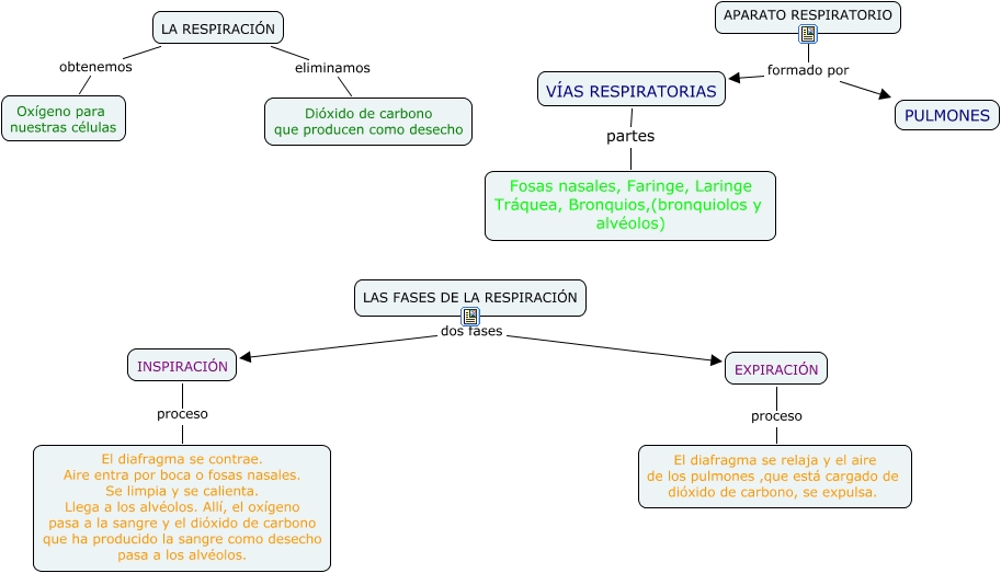 Este Cmap, tiene información relacionada con: LA RESPIRACIÓN, EXPIRACIÓN proceso El diafragma se relaja y el aire de los pulmones ,que está cargado de dióxido de carbono, se expulsa., APARATO RESPIRATORIO formado por PULMONES, APARATO RESPIRATORIO formado por VÍAS RESPIRATORIAS, LA RESPIRACIÓN eliminamos Dióxido de carbono que producen como desecho, LAS FASES DE LA RESPIRACIÓN dos fases INSPIRACIÓN, VÍAS RESPIRATORIAS partes Fosas nasales, Faringe, Laringe Tráquea, Bronquios,(bronquiolos y alvéolos), LA RESPIRACIÓN obtenemos Oxígeno para nuestras células, LAS FASES DE LA RESPIRACIÓN dos fases EXPIRACIÓN, INSPIRACIÓN proceso El diafragma se contrae. Aire entra por boca o fosas nasales. Se limpia y se calienta. Llega a los alvéolos. Allí, el oxígeno pasa a la sangre y el dióxido de carbono que ha producido la sangre como desecho pasa a los alvéolos.