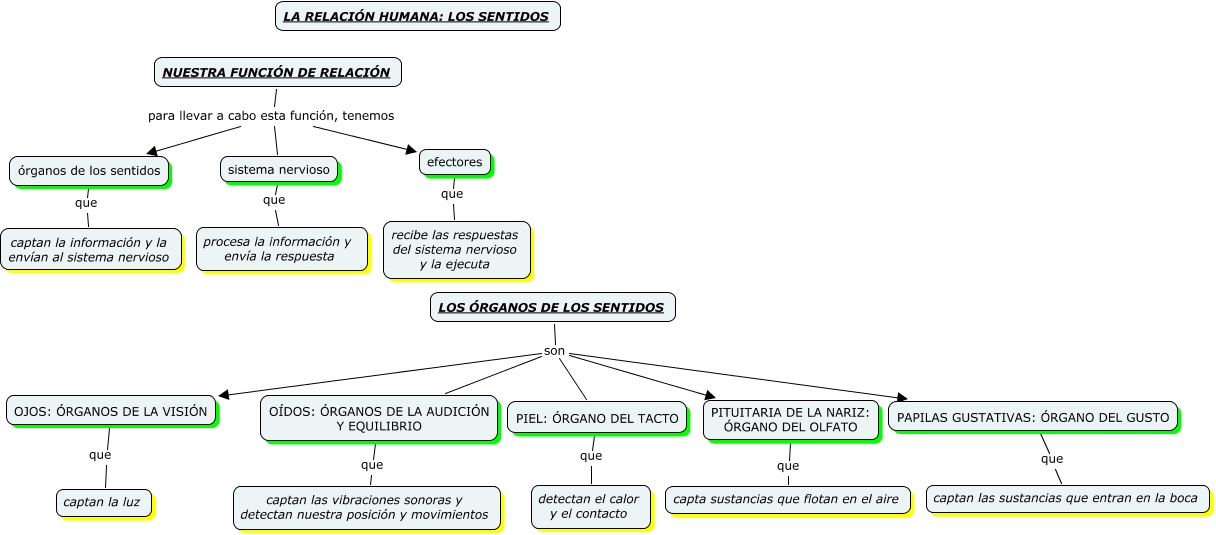 Este Cmap, tiene información relacionada con: LA RELACIÓN HUMANA- LOS SENTIDOS, PIEL: ÓRGANO DEL TACTO que detectan el calor y el contacto, NUESTRA FUNCIÓN DE RELACIÓN para llevar a cabo esta función, tenemos efectores, PAPILAS GUSTATIVAS: ÓRGANO DEL GUSTO que captan las sustancias que entran en la boca, NUESTRA FUNCIÓN DE RELACIÓN para llevar a cabo esta función, tenemos órganos de los sentidos, LOS ÓRGANOS DE LOS SENTIDOS son PAPILAS GUSTATIVAS: ÓRGANO DEL GUSTO, OJOS: ÓRGANOS DE LA VISIÓN que captan la luz, LOS ÓRGANOS DE LOS SENTIDOS son PIEL: ÓRGANO DEL TACTO, NUESTRA FUNCIÓN DE RELACIÓN para llevar a cabo esta función, tenemos sistema nervioso, LOS ÓRGANOS DE LOS SENTIDOS son PITUITARIA DE LA NARIZ: ÓRGANO DEL OLFATO, LOS ÓRGANOS DE LOS SENTIDOS son OÍDOS: ÓRGANOS DE LA AUDICIÓN Y EQUILIBRIO, OÍDOS: ÓRGANOS DE LA AUDICIÓN Y EQUILIBRIO que captan las vibraciones sonoras y detectan nuestra posición y movimientos, efectores que recibe las respuestas del sistema nervioso y la ejecuta, órganos de los sentidos que captan la información y la envían al sistema nervioso, sistema nervioso que procesa la información y envía la respuesta, PITUITARIA DE LA NARIZ: ÓRGANO DEL OLFATO que capta sustancias que flotan en el aire, LOS ÓRGANOS DE LOS SENTIDOS son OJOS: ÓRGANOS DE LA VISIÓN