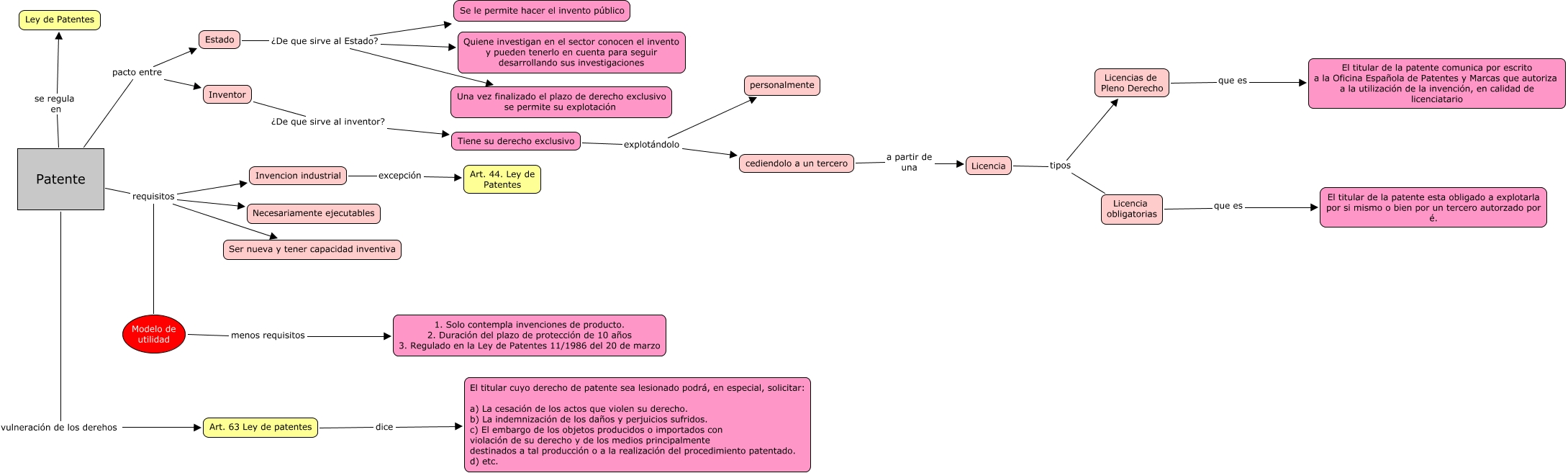 Este Cmap, tiene información relacionada con: C map Patentes, Estado ¿De que sirve al Estado? Se le permite hacer el invento público, Patente se regula en Ley de Patentes, Inventor ¿De que sirve al inventor? Tiene su derecho exclusivo, Tiene su derecho exclusivo explotándolo personalmente, Patente vulneración de los derehos Art. 63 Ley de patentes, Estado ¿De que sirve al Estado? Quiene investigan en el sector conocen el invento y pueden tenerlo en cuenta para seguir desarrollando sus investigaciones, Licencia obligatorias que es El titular de la patente esta obligado a explotarla por si mismo o bien por un tercero autorzado por é., Art. 63 Ley de patentes dice El titular cuyo derecho de patente sea lesionado podrá, en especial, solicitar: a) La cesación de los actos que violen su derecho. b) La indemnización de los daños y perjuicios sufridos. c) El embargo de los objetos producidos o importados con violación de su derecho y de los medios principalmente destinados a tal producción o a la realización del procedimiento patentado. d) etc., Licencias de Pleno Derecho que es El titular de la patente comunica por escrito a la Oficina Española de Patentes y Marcas que autoriza a la utilización de la invención, en calidad de licenciatario, Invencion industrial excepción Art. 44. Ley de Patentes, Estado ¿De que sirve al Estado? Una vez finalizado el plazo de derecho exclusivo se permite su explotación, Patente requisitos Modelo de utilidad, cediendolo a un tercero a partir de una Licencia, Patente pacto entre Estado, Patente requisitos Necesariamente ejecutables, Tiene su derecho exclusivo explotándolo cediendolo a un tercero, Licencia tipos Licencias de Pleno Derecho, Patente pacto entre Inventor, Patente requisitos Ser nueva y tener capacidad inventiva, Licencia tipos Licencia obligatorias