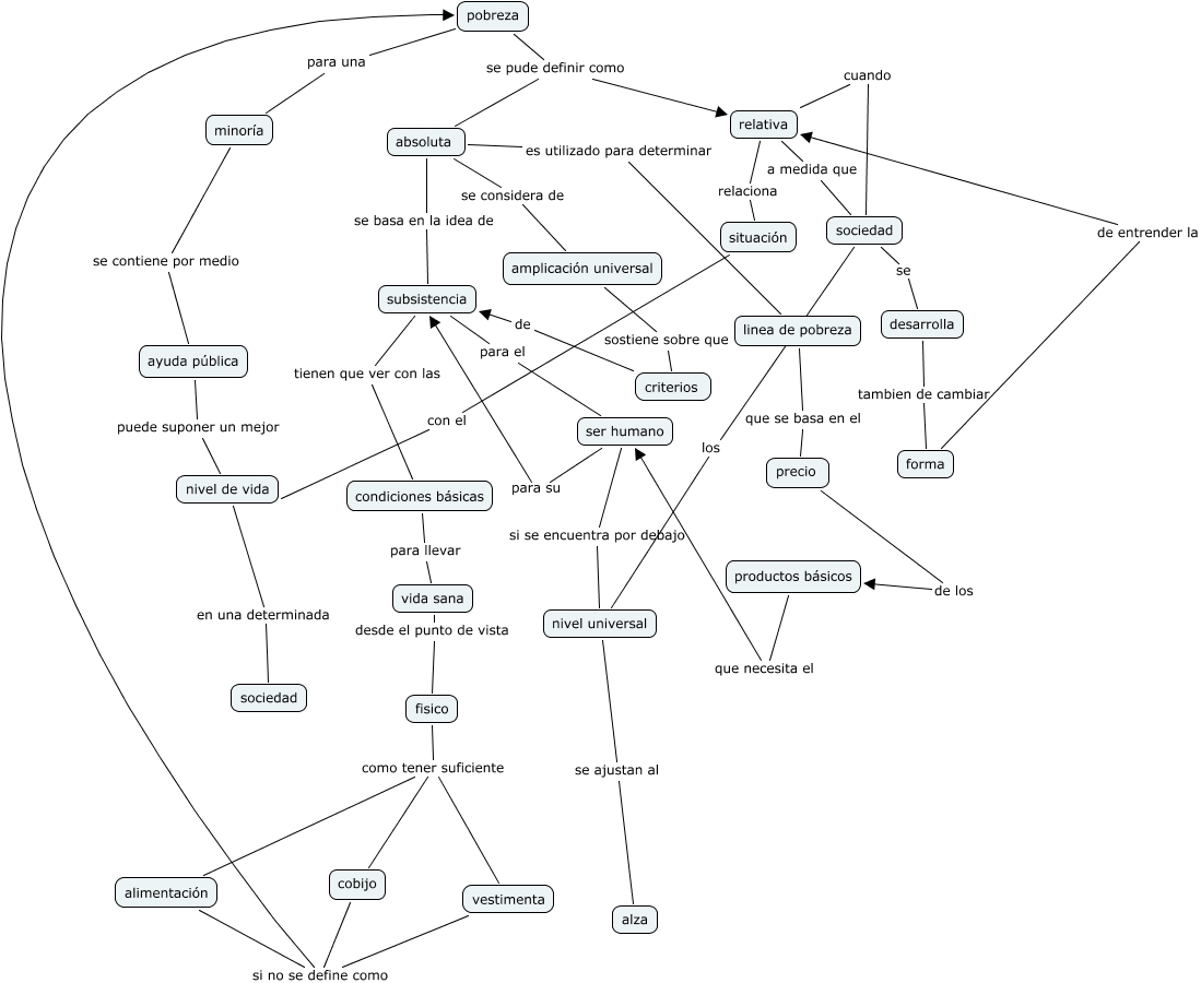 Este Cmap, tiene información relacionada con: pobreza, vida sana desde el punto de vista fisico, condiciones básicas para llevar vida sana, sociedad los nivel universal, fisico como tener suficiente alimentación, ayuda pública puede suponer un mejor nivel de vida, linea de pobreza que se basa en el precio, precio de los productos básicos, productos básicos que necesita el ser humano, absoluta se basa en la idea de subsistencia, relativa cuando sociedad, ser humano si se encuentra por debajo nivel universal, cobijo si no se define como pobreza, forma de entrender la relativa, ser humano para su subsistencia, minoría se contiene por medio ayuda pública, relativa relaciona situación, absoluta es utilizado para determinar linea de pobreza, fisico como tener suficiente cobijo, fisico como tener suficiente vestimenta, pobreza para una minoría
