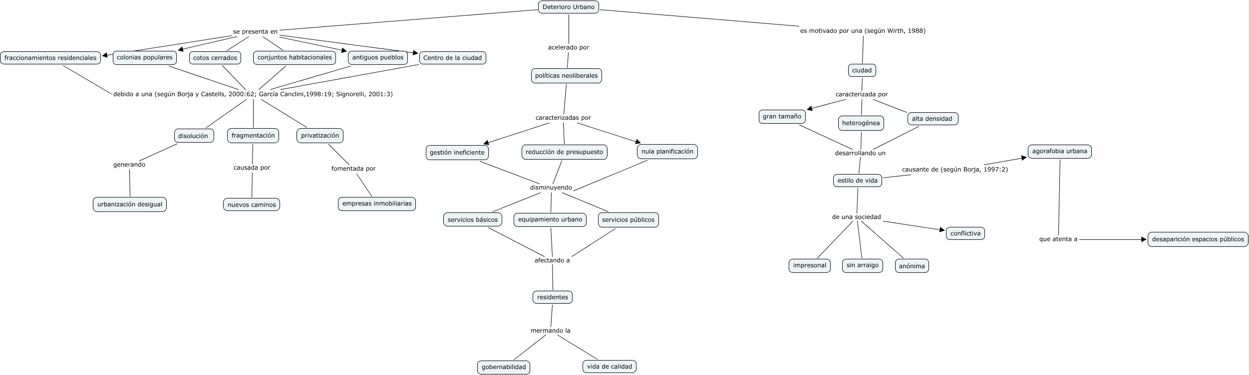 Este Cmap, tiene información relacionada con: 03 Deterioro Urbano, políticas neoliberales caracterizadas por nula planificación, gestión ineficiente disminuyendo servicios básicos, colonias populares debido a una (según Borja y Castells, 2000:62; García Canclini,1998:19; Signorelli, 2001:3) fragmentación, ciudad caracterizada por alta densidad, colonias populares debido a una (según Borja y Castells, 2000:62; García Canclini,1998:19; Signorelli, 2001:3) disolución, antiguos pueblos debido a una (según Borja y Castells, 2000:62; García Canclini,1998:19; Signorelli, 2001:3) fragmentación, reducción de presupuesto disminuyendo equipamiento urbano, reducción de presupuesto disminuyendo servicios públicos, Centro de la ciudad debido a una (según Borja y Castells, 2000:62; García Canclini,1998:19; Signorelli, 2001:3) privatización, ciudad caracterizada por gran tamaño, fragmentación causada por nuevos caminos, políticas neoliberales caracterizadas por gestión ineficiente, residentes mermando la gobernabilidad, fraccionamientos residenciales debido a una (según Borja y Castells, 2000:62; García Canclini,1998:19; Signorelli, 2001:3) privatización, privatización fomentada por empresas inmobiliarias, gran tamaño desarrollando un estilo de vida, gestión ineficiente disminuyendo equipamiento urbano, alta densidad desarrollando un estilo de vida, Deterioro Urbano se presenta en cotos cerrados, políticas neoliberales caracterizadas por reducción de presupuesto