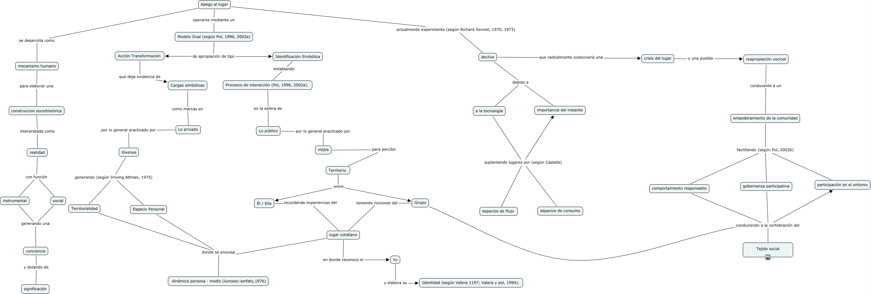 Este Cmap, tiene información relacionada con: 04 Condicionantes de apego al lugar, crisis del lugar y una posible reapropiación vecinal, Lo privado por lo general practicado por Jóvenes, social generando una conciencia, Él / Ella recordando experiencias del lugar cotidiano, Cargas simbólicas como marcas en Lo privado, reapropiación vecinal conducente a un empoderamiento de la comunidad, empoderamiento de la comunidad facilitando (según Pol, 2002b) gobernanza participativa, Espacio Personal donde se procesa dinámica persona - medio (korosec-serfaty,1976), empoderamiento de la comunidad facilitando (según Pol, 2002b) participación en el entorno, empoderamiento de la comunidad facilitando (según Pol, 2002b) comportamiento responsable, Acción Transformación que deja evidencia de Cargas simbólicas, Grupo teniendo nociones del lugar cotidiano, declive que radicalmente ocasionaría una crisis del lugar, mecanismo humano para elaborar una construccion sociohistórica, lugar cotidiano en donde reconoce el Yo, Yo y elabora su Identidad (según Valera 1197; Valera y pol, 1994)., comportamiento responsable conduciendo a la vertebración del participación en el entorno, comportamiento responsable conduciendo a la vertebración del Tejido social, gobernanza participativa conduciendo a la vertebración del participación en el entorno, a la tecnología suplantando lugares por (según Castells) espacios de flujo