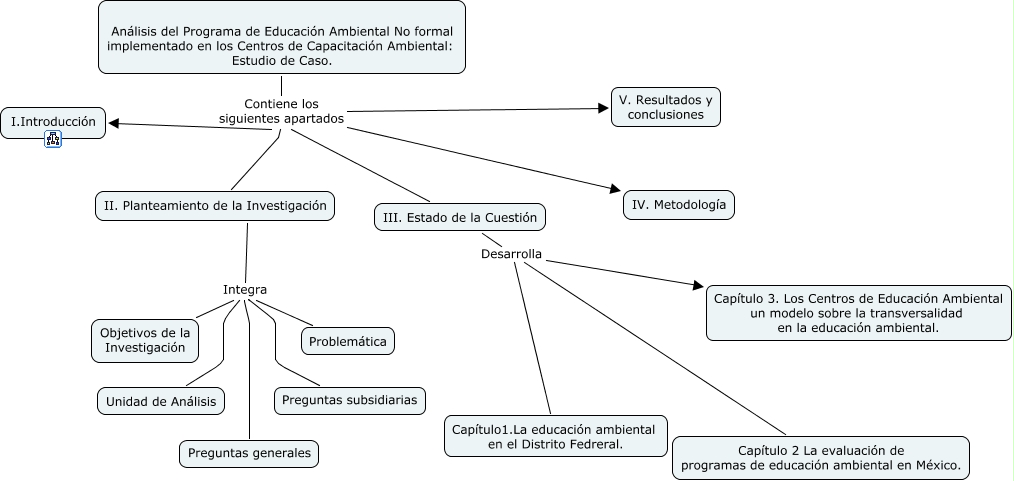 Este Cmap, tiene información relacionada con: Proyecto de investigación, II. Planteamiento de la Investigación Integra Preguntas subsidiarias, III. Estado de la Cuestión Desarrolla Capítulo1.La educación ambiental en el Distrito Fedreral., Análisis del Programa de Educación Ambiental No formal implementado en los Centros de Capacitación Ambiental: Estudio de Caso. Contiene los siguientes apartados IV. Metodología, Análisis del Programa de Educación Ambiental No formal implementado en los Centros de Capacitación Ambiental: Estudio de Caso. Contiene los siguientes apartados I.Introducción, Análisis del Programa de Educación Ambiental No formal implementado en los Centros de Capacitación Ambiental: Estudio de Caso. Contiene los siguientes apartados II. Planteamiento de la Investigación, II. Planteamiento de la Investigación Integra Objetivos de la Investigación, III. Estado de la Cuestión Desarrolla Capítulo 2 La evaluación de programas de educación ambiental en México., Análisis del Programa de Educación Ambiental No formal implementado en los Centros de Capacitación Ambiental: Estudio de Caso. Contiene los siguientes apartados V. Resultados y conclusiones, III. Estado de la Cuestión Desarrolla Capítulo 3. Los Centros de Educación Ambiental un modelo sobre la transversalidad en la educación ambiental., II. Planteamiento de la Investigación Integra Problemática, Análisis del Programa de Educación Ambiental No formal implementado en los Centros de Capacitación Ambiental: Estudio de Caso. Contiene los siguientes apartados III. Estado de la Cuestión, II. Planteamiento de la Investigación Integra Preguntas generales, II. Planteamiento de la Investigación Integra Unidad de Análisis