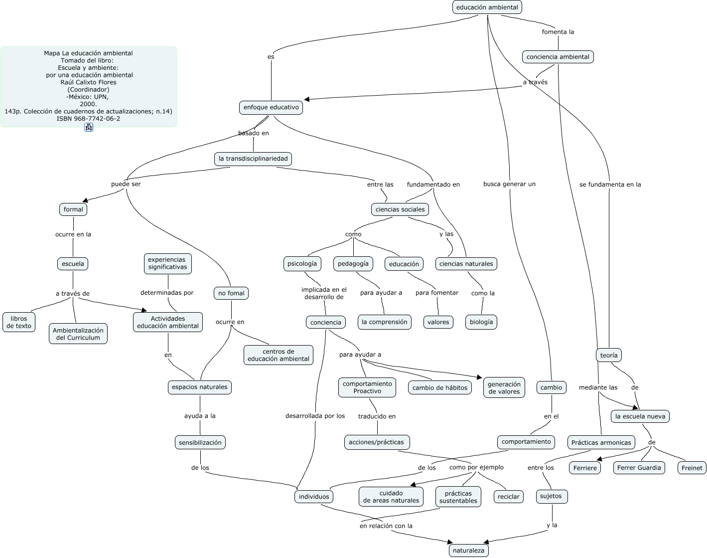 Este Cmap, tiene información relacionada con: mapa_libro_educación ambiental_escuela, conciencia para ayudar a cambio de hábitos, enfoque educativo puede ser no fomal, educación para fomentar valores, teoría de la escuela nueva, educación ambiental es enfoque educativo, conciencia para ayudar a generación de valores, escuela a través de libros de texto, conciencia para ayudar a comportamiento Proactivo, comportamiento Proactivo traducido en acciones/prácticas, cambio en el comportamiento, conciencia ambiental mediante las Prácticas armonicas, acciones/prácticas como por ejemplo cuidado de areas naturales, acciones/prácticas como por ejemplo reciclar, educación ambiental se fundamenta en la teoría, no fomal ocurre en centros de educación ambiental, enfoque educativo basado en la transdisciplinariedad, la transdisciplinariedad puede ser no fomal, formal ocurre en la escuela, educación ambiental fomenta la conciencia ambiental, ciencias sociales y las ciencias naturales