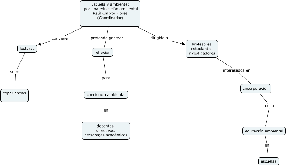 Este Cmap, tiene información relacionada con: Intruducción, lecturas sobre experiencias, Escuela y ambiente: por una educación ambiental Raúl Calixto Flores (Coordinador) contiene lecturas, reflexión para conciencia ambiental, Escuela y ambiente: por una educación ambiental Raúl Calixto Flores (Coordinador) pretende generar reflexión, Escuela y ambiente: por una educación ambiental Raúl Calixto Flores (Coordinador) dirigido a Profesores estudiantes investigadores, Incorporación de la educación ambiental, educación ambiental en escuelas, conciencia ambiental en docentes, directivos, personajes académicos, Profesores estudiantes investigadores interesados en Incorporación