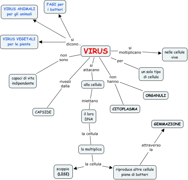 Questa Cmap, creata con IHMC CmapTools, contiene informazioni relative a: VIRUS, lo moltiplica la cellula scoppia (LISI), VIRUS per un solo tipo di cellula, alla cellula iniettano il loro DNA, VIRUS si attacano alla cellula, VIRUS si dicono VIRUS VEGETALI per le piente, VIRUS si moltiplicano nelle cellule vive, lo moltiplica la cellula riproduce altre cellule piene di batteri, VIRUS non sono capaci di vita indipendente, VIRUS rivesti dalla CAPSIDE, riproduce altre cellule piene di batteri attraverso la GEMMAZIONE, VIRUS non hanno CITOPLASMA, VIRUS si dicono FAGI per i batteri, VIRUS non hanno ORGANULI, VIRUS si dicono VIRUS ANIMALI per gli animali, il loro DNA la cellula lo moltiplica