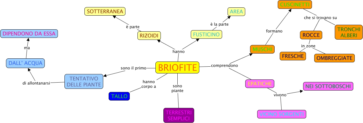 Questa Cmap, creata con IHMC CmapTools, contiene informazioni relative a: BRIOFITE, BRIOFITE comprendono EPATICHE, BRIOFITE hanno FUSTICINO, CUSCINETTI che si trovano su ROCCE, FUSTICINO è la parte AREA, BRIOFITE comprendono MUSCHI, BRIOFITE hanno corpo a TALLO, EPATICHE vivono VICINO SORGENTI, EPATICHE vivono NEI SOTTOBOSCHI, RIZOIDI è parte SOTTERRANEA, MUSCHI formano CUSCINETTI, CUSCINETTI che si trovano su TRONCHI ALBERI, DALL' ACQUA ma DIPENDONO DA ESSA, TENTATIVO DELLE PIANTE di allontanarsi DALL' ACQUA, ROCCE in zone FRESCHE, BRIOFITE hanno RIZOIDI, BRIOFITE sono il primo TENTATIVO DELLE PIANTE, BRIOFITE sono piante TERRESTRI SEMPLICI, ROCCE in zone OMBREGGIATE