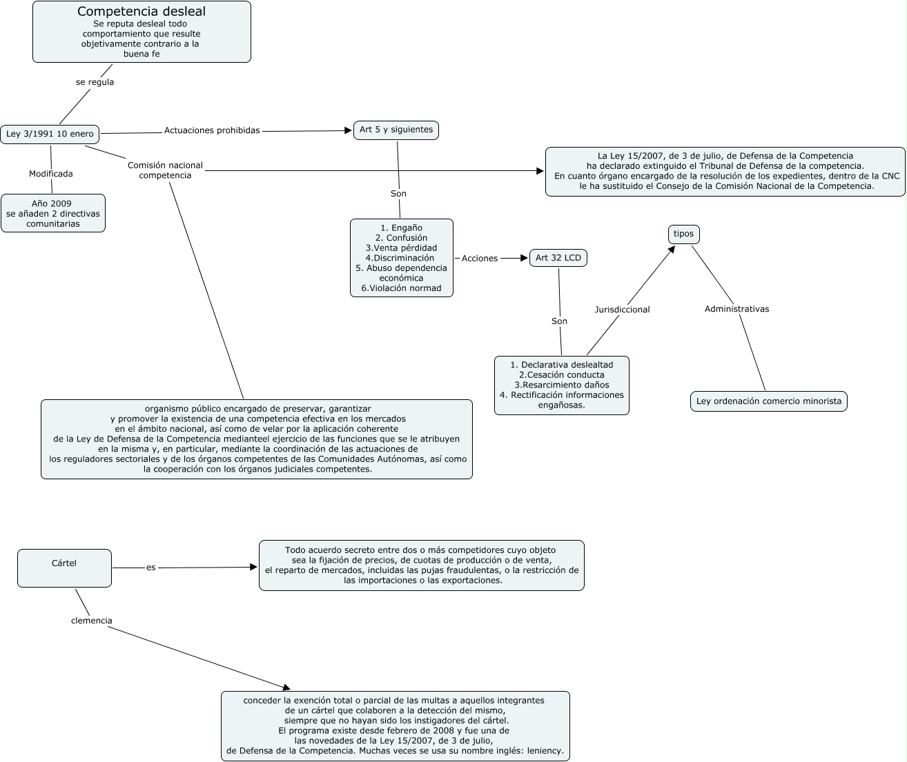 Este Cmap, tiene información relacionada con: totunclam modificado, Cártel clemencia conceder la exención total o parcial de las multas a aquellos integrantes de un cártel que colaboren a la detección del mismo, siempre que no hayan sido los instigadores del cártel. El programa existe desde febrero de 2008 y fue una de las novedades de la Ley 15/2007, de 3 de julio, de Defensa de la Competencia. Muchas veces se usa su nombre inglés: leniency., Ley 3/1991 10 enero Comisión nacional competencia La Ley 15/2007, de 3 de julio, de Defensa de la Competencia ha declarado extinguido el Tribunal de Defensa de la competencia. En cuanto órgano encargado de la resolución de los expedientes, dentro de la CNC le ha sustituido el Consejo de la Comisión Nacional de la Competencia., Ley 3/1991 10 enero Modificada Año 2009 se añaden 2 directivas comunitarias, Ley 3/1991 10 enero Comisión nacional competencia organismo público encargado de preservar, garantizar y promover la existencia de una competencia efectiva en los mercados en el ámbito nacional, así como de velar por la aplicación coherente de la Ley de Defensa de la Competencia medianteel ejercicio de las funciones que se le atribuyen en la misma y, en particular, mediante la coordinación de las actuaciones de los reguladores sectoriales y de los órganos competentes de las Comunidades Autónomas, así como la cooperación con los órganos judiciales competentes., Ley 3/1991 10 enero Actuaciones prohibidas Art 5 y siguientes, 1. Declarativa deslealtad 2.Cesación conducta 3.Resarcimiento daños 4. Rectificación informaciones engañosas. Jurisdiccional tipos, 1. Engaño 2. Confusión 3.Venta pérdidad 4.Discriminación 5. Abuso dependencia económica 6.Violación normad Acciones Art 32 LCD, Cártel es Todo acuerdo secreto entre dos o más competidores cuyo objeto sea la fijación de precios, de cuotas de producción o de venta, el reparto de mercados, incluidas las pujas fraudulentas, o la restricción de las importaciones o las exportaciones., Art 5 y siguientes Son 1. Engaño 2. Confusión 3.Venta pérdidad 4.Discriminación 5. Abuso dependencia económica 6.Violación normad, Competencia desleal Se reputa desleal todo comportamiento que resulte objetivamente contrario a la buena fe se regula Ley 3/1991 10 enero, Art 32 LCD Son 1. Declarativa deslealtad 2.Cesación conducta 3.Resarcimiento daños 4. Rectificación informaciones engañosas., tipos Administrativas Ley ordenación comercio minorista