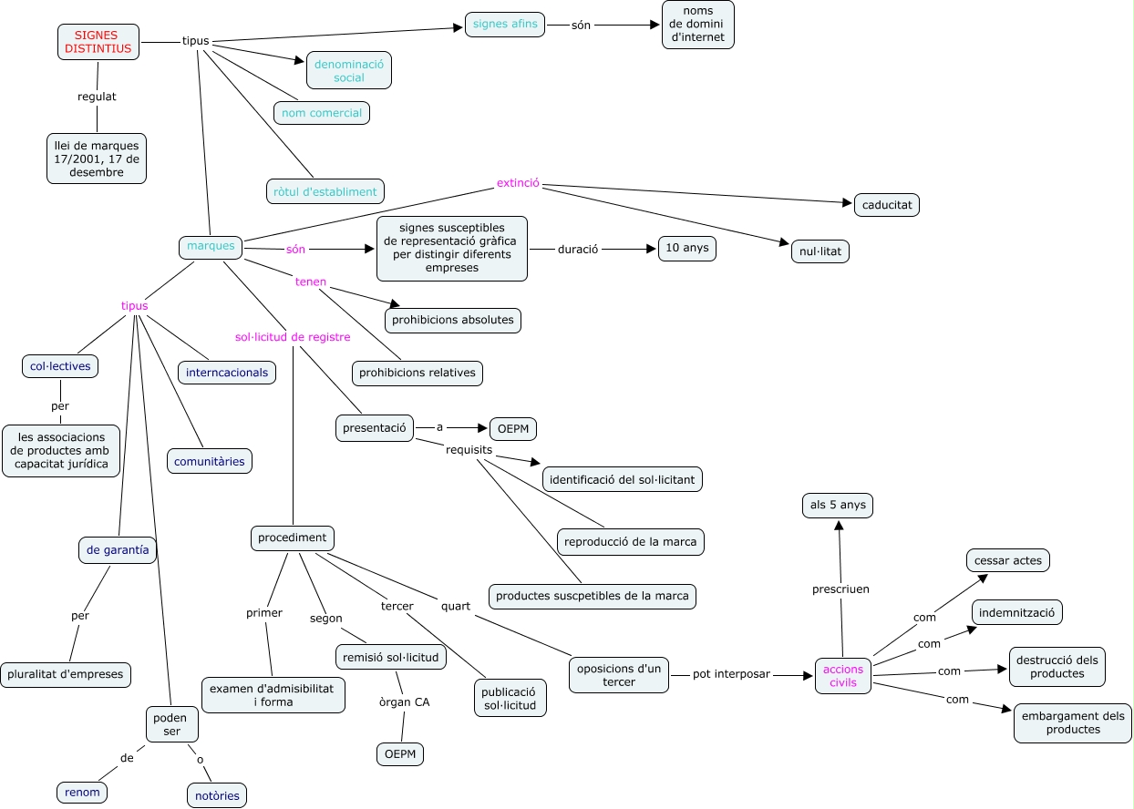 Este Cmap, tiene información relacionada con: marques, SIGNES DISTINTIUS regulat llei de marques 17/2001, 17 de desembre, marques sol·licitud de registre procediment, poden ser de renom, accions civils com cessar actes, accions civils com indemnització, de garantía per pluralitat d'empreses, presentació requisits identificació del sol·licitant, col·lectives per les associacions de productes amb capacitat jurídica, SIGNES DISTINTIUS tipus denominació social, SIGNES DISTINTIUS tipus marques, procediment segon remisió sol·licitud, procediment primer examen d'admisibilitat i forma, marques tipus comunitàries, marques extinció caducitat, accions civils prescriuen als 5 anys, marques tipus interncacionals, presentació requisits productes suscpetibles de la marca, marques tenen prohibicions absolutes, SIGNES DISTINTIUS tipus ròtul d'establiment, marques tipus de garantía